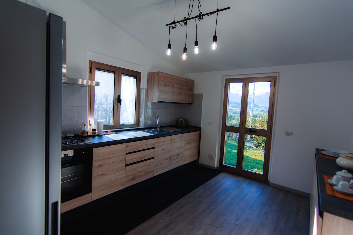 The house with a view of the Sibillini mountains is on 2 floors and consists of: Ground floor: -1 veranda with sofa beds, armchairs and view of the mountains -1 spacious entrance to the living room with 2 sofa beds -1 fully equipped kitchen -1 service bathroom with usable washing machine On the 1nd floor: -1 double bedroom -1 room with two bunk beds -1 complete bathroom with large shower box All surrounded by greenery and peace in the countryside in the Sibillini Mountains National Park