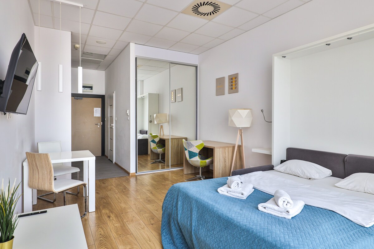 Comfortable, fully equipped apartment in a new building. A living room with an open kitchen divided into a dining and sitting area. The bedroom has a queen bed and a spacious closet. There's also a walk-in closet as an extra storage space. There are shops, restaurants and cafes in the area Equipment: air conditioning, coffee maker, kettle, iron, ironing board, washing machine Directions from Chopin Airport 20 min taxi 50 min communication from Modlin Airport 50 min taxi 120 min communication