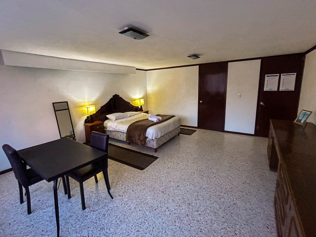A unique and ideal space for you. Completely independent with a double bed, full bathroom, refrigerator and kitchenette. It is ideal for 1 or 2 people, a very bright space with wifi ideal for working from home. Enjoy cable TV, electricity and hot water all day and with a good view being on the upper floor. Excellent location, with transportation services, one block from the metrobus. It is 20 minutes from the CAPU terminal, OXXO is a 5-minute walk, pharmacies and the market are 3 blocks away