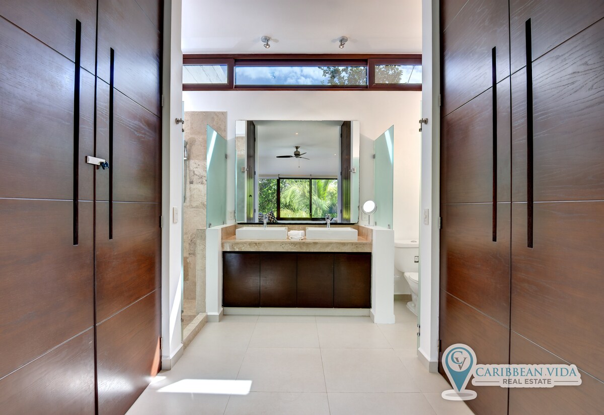Private villa in Puerto Aventuras with 5 bedrooms, infinity pool, and jacuzzi. Enjoy ocean views from every room, a fully equipped kitchen, daily housekeeping, and concierge service. Located in a gated community with 24/7 security, just a 10-minute walk to beaches and beach clubs. Perfect for disconnecting, reconnecting with nature, and enjoying water sports, golf, and dining. Maximum capacity: 10 guests.