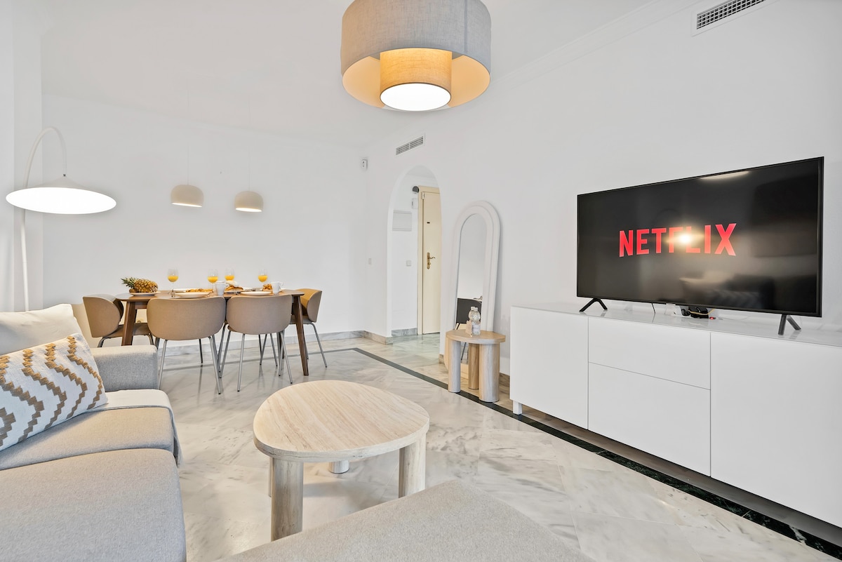 Stay in this stunning newly renovated duplex penthouse in La Maestranza. Walk to Puerto Banús, beaches, El Corte Inglés, top restaurants, and shops. Within 2 minutes walking you have a supermarket, restaurants, butcher & shops. With 3 stylish bedrooms, 3 terraces, modern Scandinavian interiors, and garage parking, it’s perfect for families or friends. Enjoy gated security, pools, lush gardens, a gas BBQ, and beautiful views of La Concha mountain—your dream Marbella escape awaits! 🌞✨ Welcome!