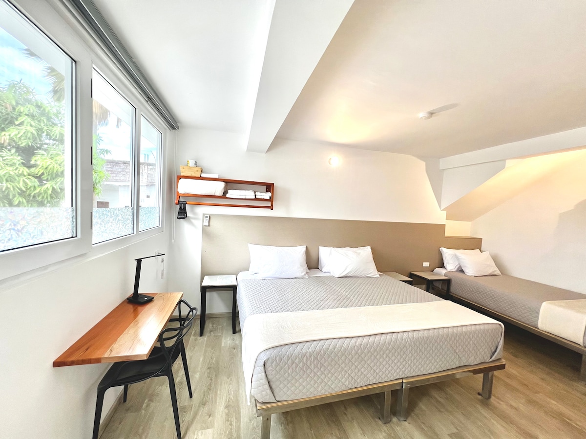 Rest in a space with double-glazed windows that reduce outside noise, equipped with international standard mattresses, sheets and towels. Located in Playa de Oro, on a second floor just steps from the Malecón. Close to food stores, laundromats, pharmacies and bakeries.