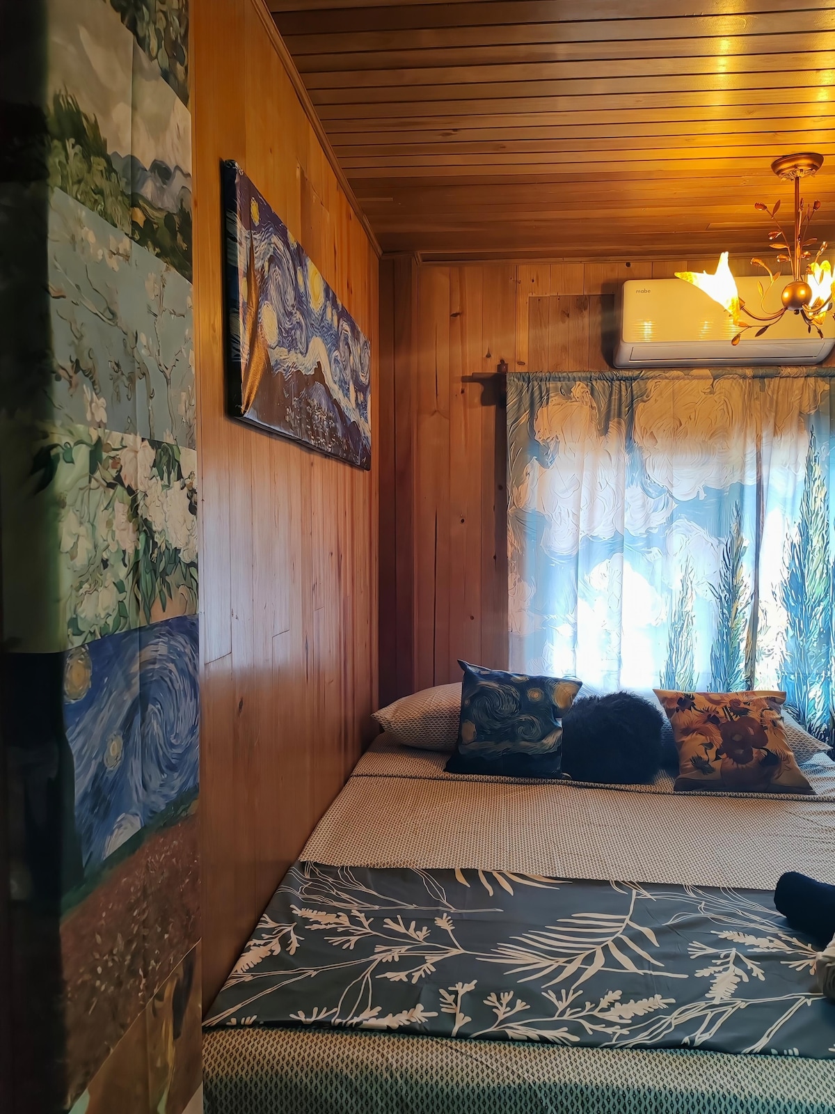 La esquina de Van Gogh un espacio pensado para enamorar los sentidos. Con su interior de madera que da esa sensación de cambiar de entorno y sentir que entras a una cabaña en el bosque llena de arte. Este loft te invita a vivir una estancia íntima y serena, con una confortable cama queen, cocineta, baño privado y sus rincones diseñados para descansar e inspirarse. Ideal para parejas o viajeros que buscan paz y comodidad, una experiencia única, donde cada esquina cuenta una historia diferente.