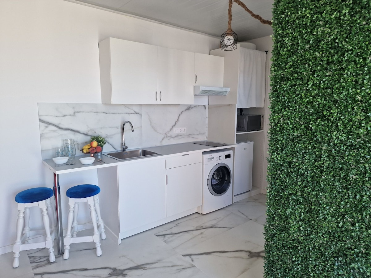 Welcome to a special space you won't want to leave. This spacious studio apartment opens up onto your own private terrace where you can enjoy a dinner, sunbathe and a refreshing outdoor shower. This studio has an open living, dining and kitchen space with a special corner for the built in bed and separate bathroom. You'll also find a separate snug on the terrace that you can use for work or just relaxing. The apartment also provides a portable cinema projector.