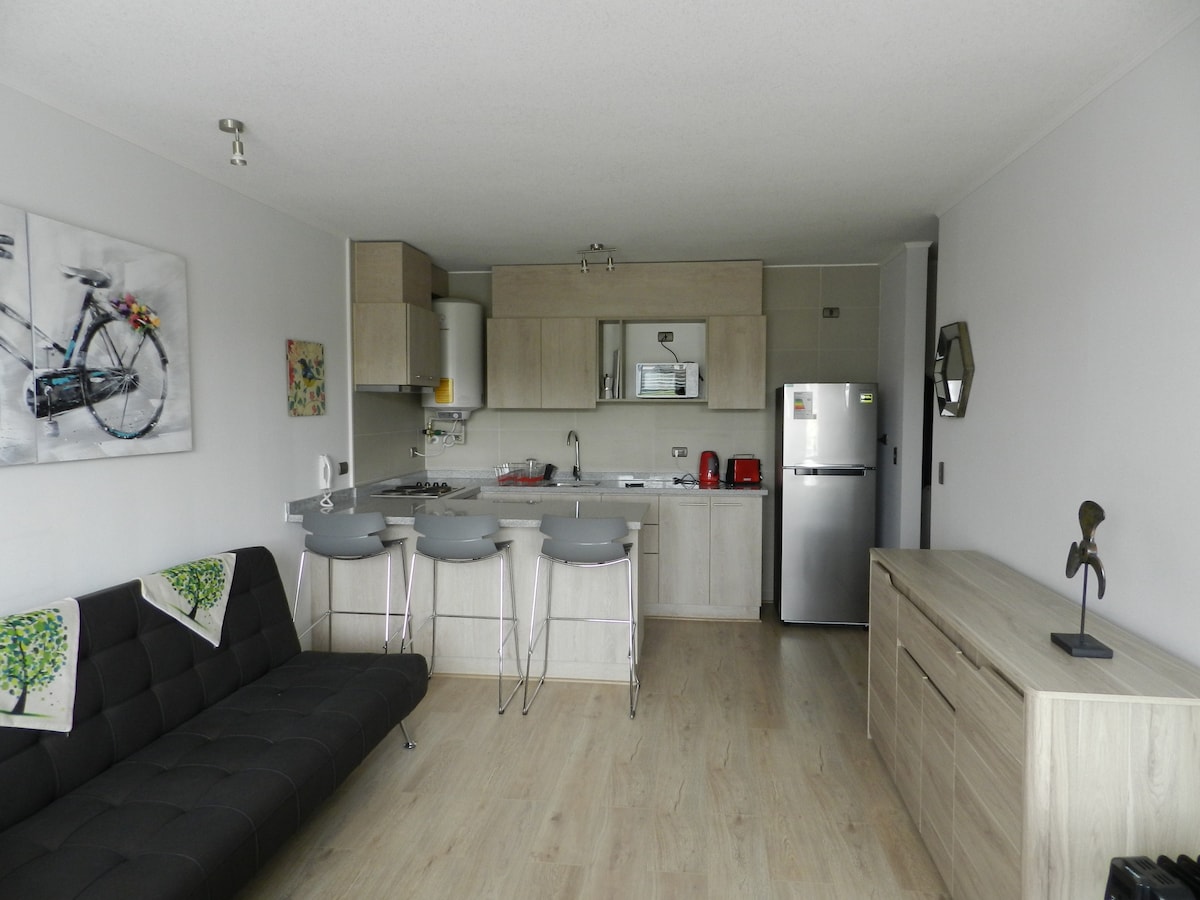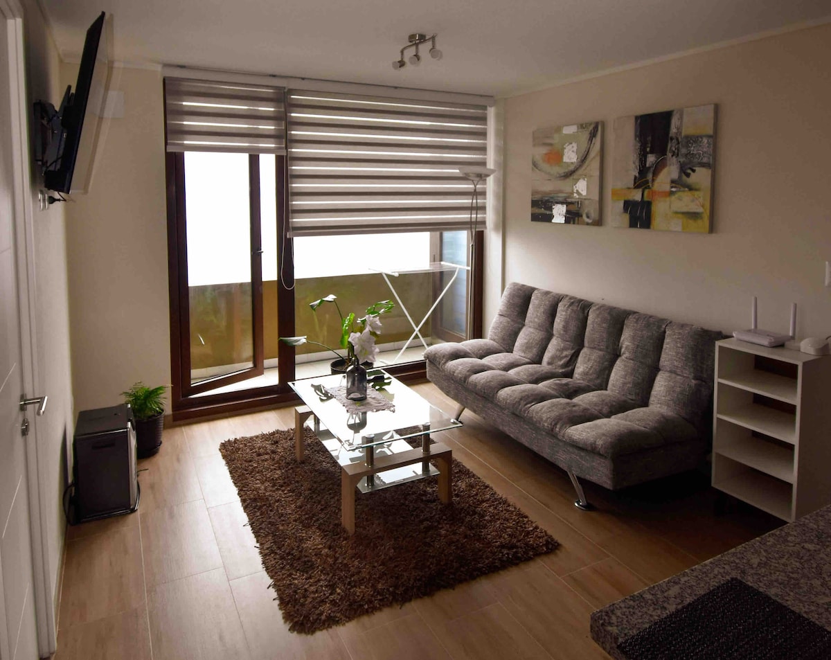 Fully furnished apartment, on the third floor, overlooking the main avenue, bedroom with a double bed and sofa bed for 1 child or 1 young adult, wifi, cable TV (VTR), private parking (free upon confirmation), 5 minutes from downtown on foot. Walking distance to supermarkets, cafes, restaurants and shops of different types. Public transportation at the door. Health center a few blocks away. Pleasant common areas for the comfort of vacations, business trips and/or others.