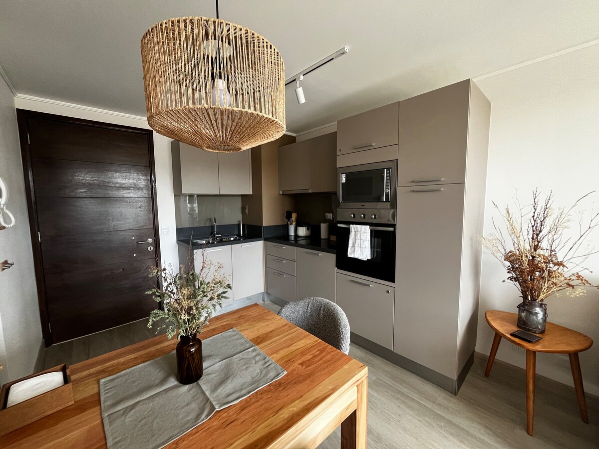 Enjoy a unique Patagonian experience in a warm, comfortable, and thoughtfully designed space, perfect for relaxing after exploring Torres del Paine. Features 2 en-suite bedrooms, a fully equipped kitchen, central heating, and high-speed internet. Native wood furniture adds a natural and cozy touch. Located minutes from downtown, with access to a pool, gym, and parking.