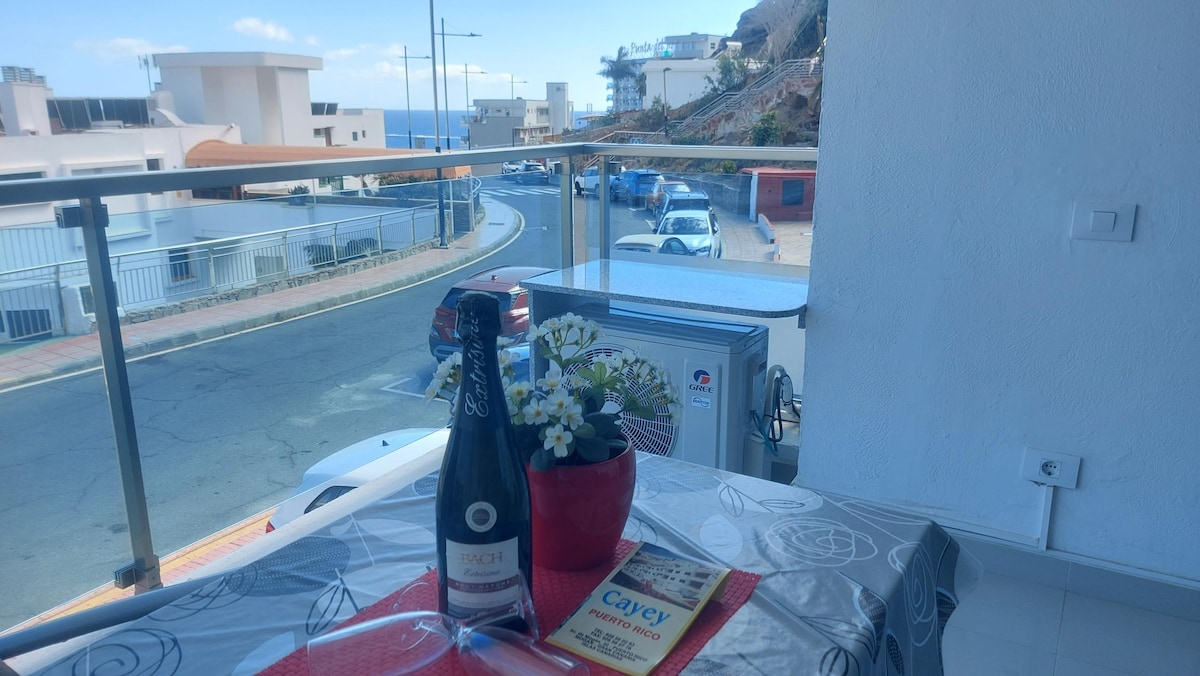 Charming beachfront apartment, ideal for 3 guests. It features a bedroom, sofa bed, bathroom, fully equipped kitchen, Wi-Fi, and a glassed-in terrace with direct views of the ocean and Puerto Rico beach. The complex offers a swimming pool and two elevators to access the apartment. Just a 3-minute walk from the beach and close to shopping centers, restaurants, supermarkets, and public transport. Perfect to enjoy the south of Gran Canaria!