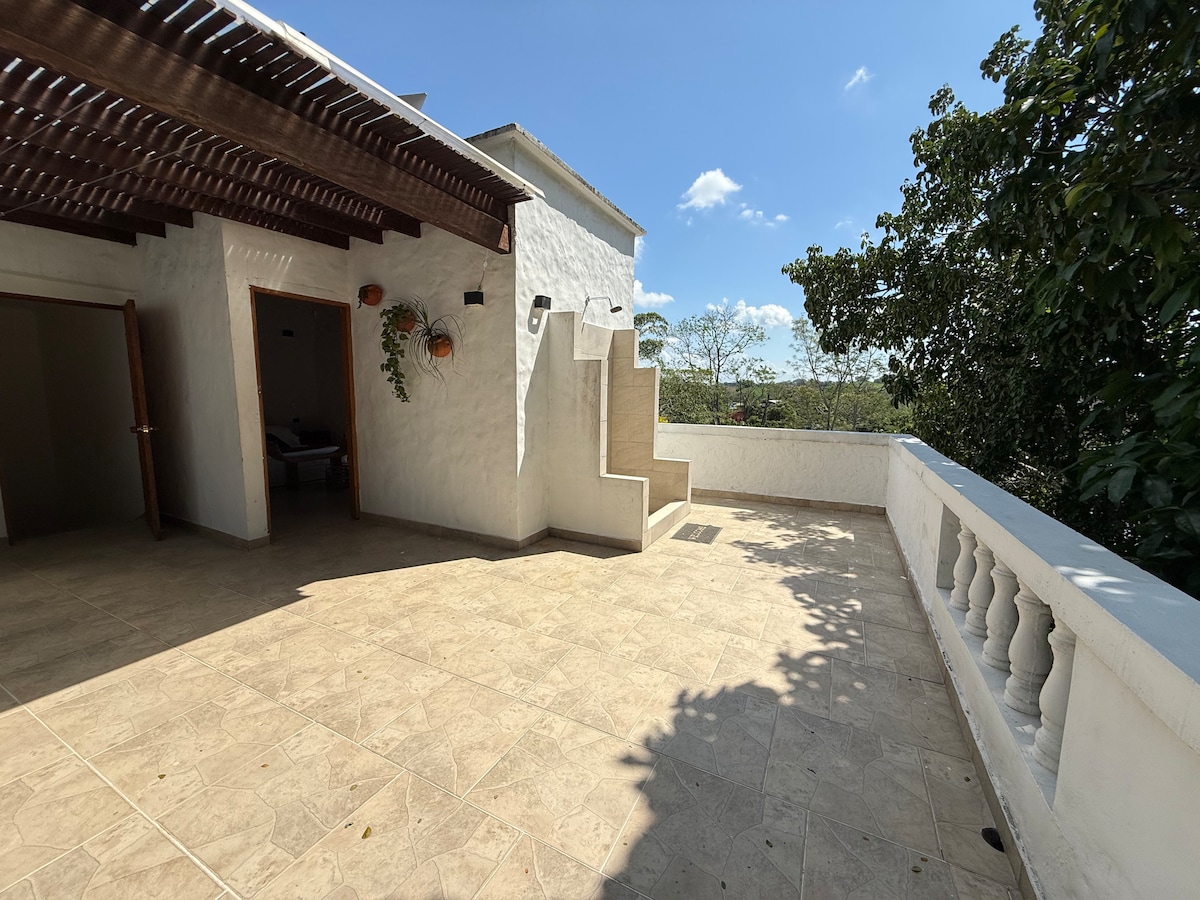 Enjoy this central and picturesque accommodation of the Colombian santorini overlooking the fountain alley to share with family, friends, or partner. Close to Napoles 2.5 km. Natural reserve clear river 20 min. and close to supermarkets and restaurants. The house has 1 bedroom with double bed. another with 2 beds for 3 pax with private bathroom. both bedrooms have air conditioning and fans. Living room with sofacam for 2 pax and bathroom, equipped kitchen, dining room, patio, wifi, TV, free parking