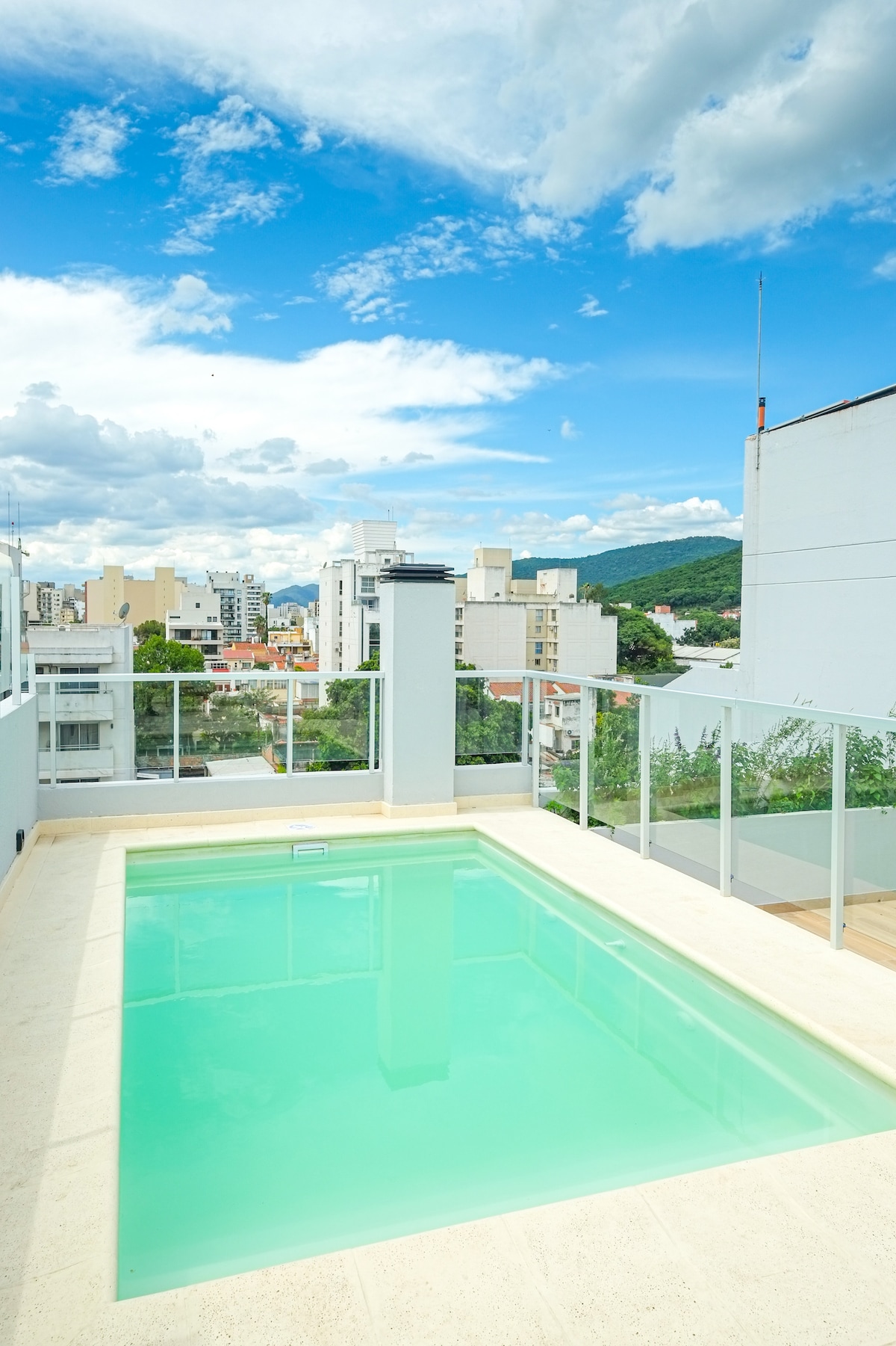 This modern apartment with an incredible view of La Vina Church is the perfect choice to enjoy your vacation in the historic center of Salta City. Just 5 blocks from the Cathedral and Plaza 9 de Julio. It includes all bed linen, towels, and personal hygiene items for 4 people. Fully-equipped kitchen. A queen-size bed and a sofa-bed. Pool on the terrace with panoramic views of the city.