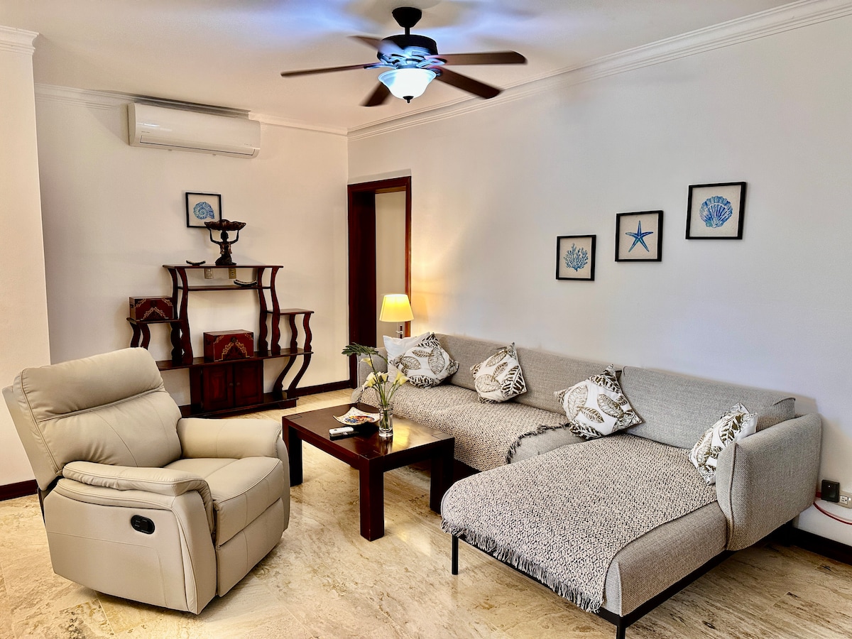 2 bedroom, 3 beds, 2.5 bath. Fully equipped kitchen. Amenities: Pool, Olympic size pool, outdoor gym, tennis court, basketball court, children park, Golf and Restaurant, private beach with popular restaurant, Kukua & beauty parlor. Centrally located, car or an uber is highly recommended. Apartment sits in front of golf course in Punta Blanca Golf and Beach Resort. A separate electric charge will be sent at a rate of .45 per kilowatt.