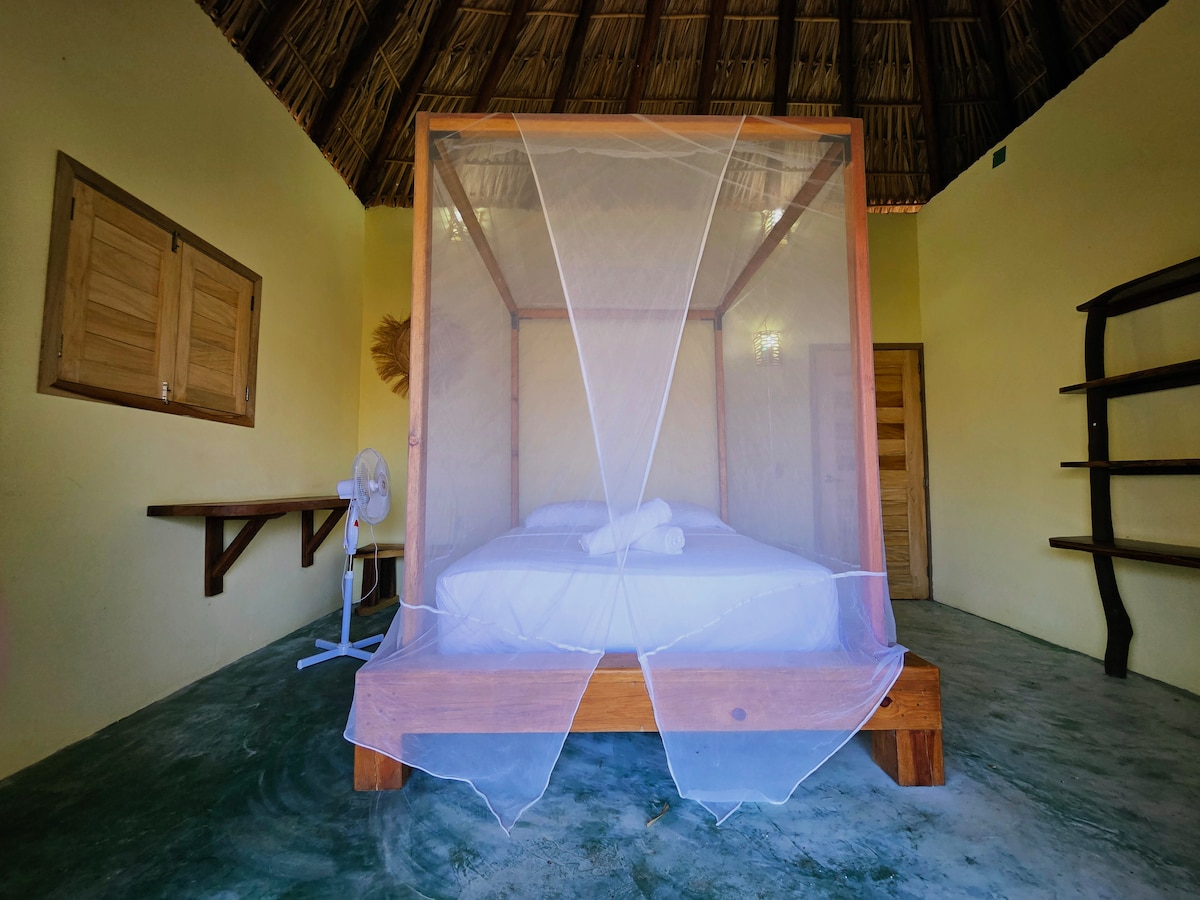 Una Posada Mas has an excellent location on Calle Rinconcito, steps from the road to Punta Cometa, bakery, juices, restaurants and just 2 minutes from the sea. The tropical plant garden lowers the temperature inside the posada, ideal for cooling off and relaxing after a day at the beach. Rooms 5 and 6 have a double bed, ample mosquito netting, a fan and a private bathroom. Located on the top floor, with a palm roof and large windows that let in the air and the green of the plants.