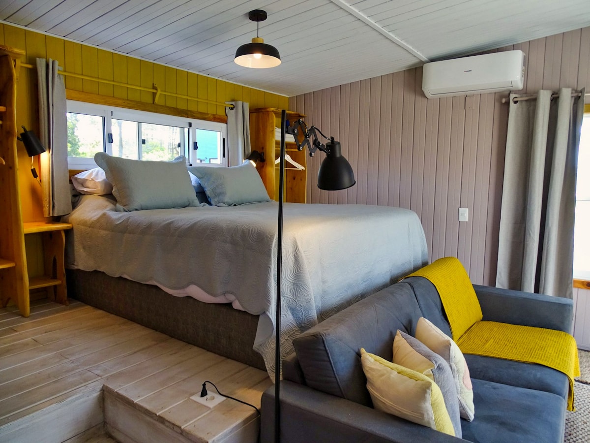 Our accommodation has three cabins surrounded by nature in a very quiet area 800 meters walk from La Viuda beach, decorated with designer objects of our own design and designed for the enjoyment of our guests. Two wooden cabins, ideal for couples and families, accommodating up to 4 people. A studio with a bathroom and private terrace in a shipping container, ideal for couples. The service is personalized, we live on the same property. Thank you for choosing us! Fabiana and Miguel