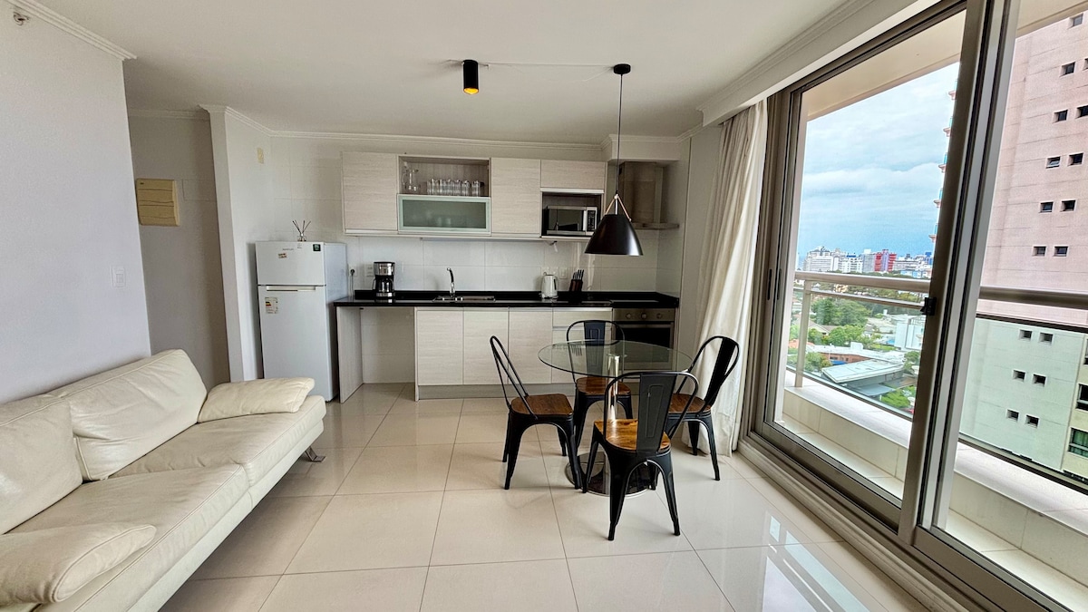 Moderno apartamento para 2 personas totalmente equipado con espectacular vista al mar y la península con 2 balcones, situado a cuadras del centro y de las playas mansa & brava. Incluye el uso de cochera propia, amenities de alta categoría como piscina interna y externa, sauna, gimnasio, business lounge y recepción atendida 24h. Ideal para relajarse y disfrutar de Punta del Este durante todo el año o combinar descanso y trabajo ya que dispone de una conexión rápida de internet (200 Mbps).