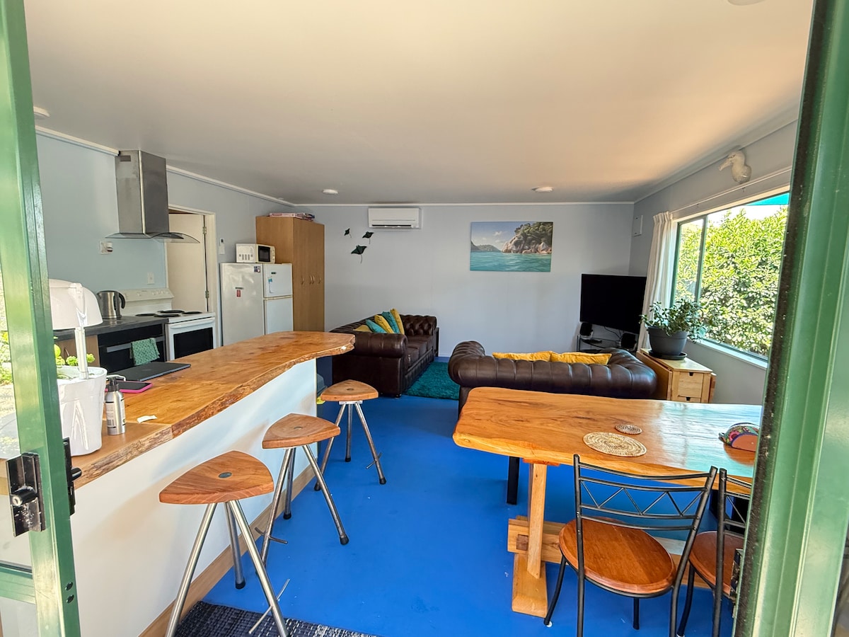 Modern architectural kiwi bach nestled on the edge of a tidal lagoon between Ligar Bay and Tata Beach. The Bach is a compact 55sqm with a large sheltered and covered deck with all day sun. A master bedroom links on to a compact lounge & ensuite bathroom, dining & kitchen area from either side all with full views of the water & lagoon. There is a seperate sleeping pod with a Queen size bed 2 metres from main dwelling for an extra 2 guests. Amazing second Hot outdoor shower under the trees.