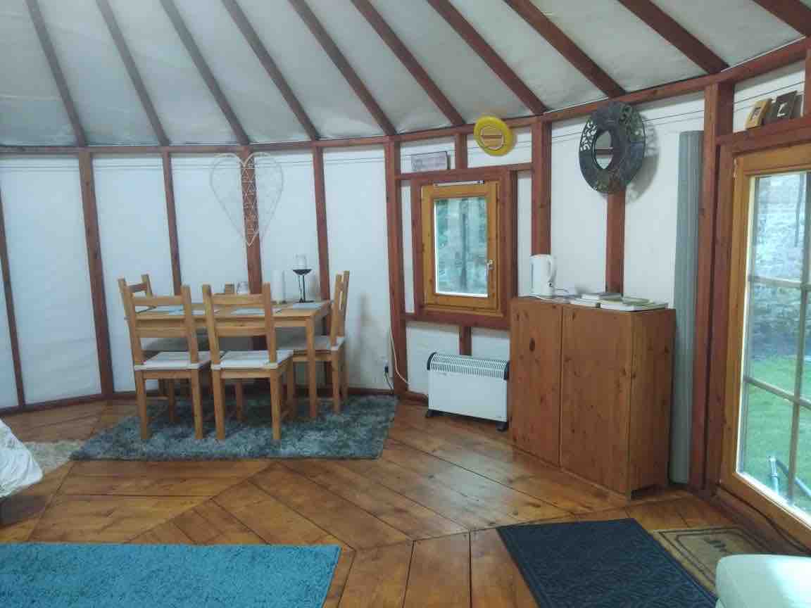 Ower Farm Yurt located on a beautiful rural farm overlooking Poole Harbour on The Isle of Purbeck Dorset. The Yurt has been specially designed by a local Yurt maker and is made of highest quality materials. Light, spacious and airy with a domed roof allowing natural light in and positioned in a cool area of this beautiful farm surrounded by animals and nature. Guests can order a Full English breakfast and have it delivered unlimited fresh coffee/tea pot at an additional cost of £12.50pp