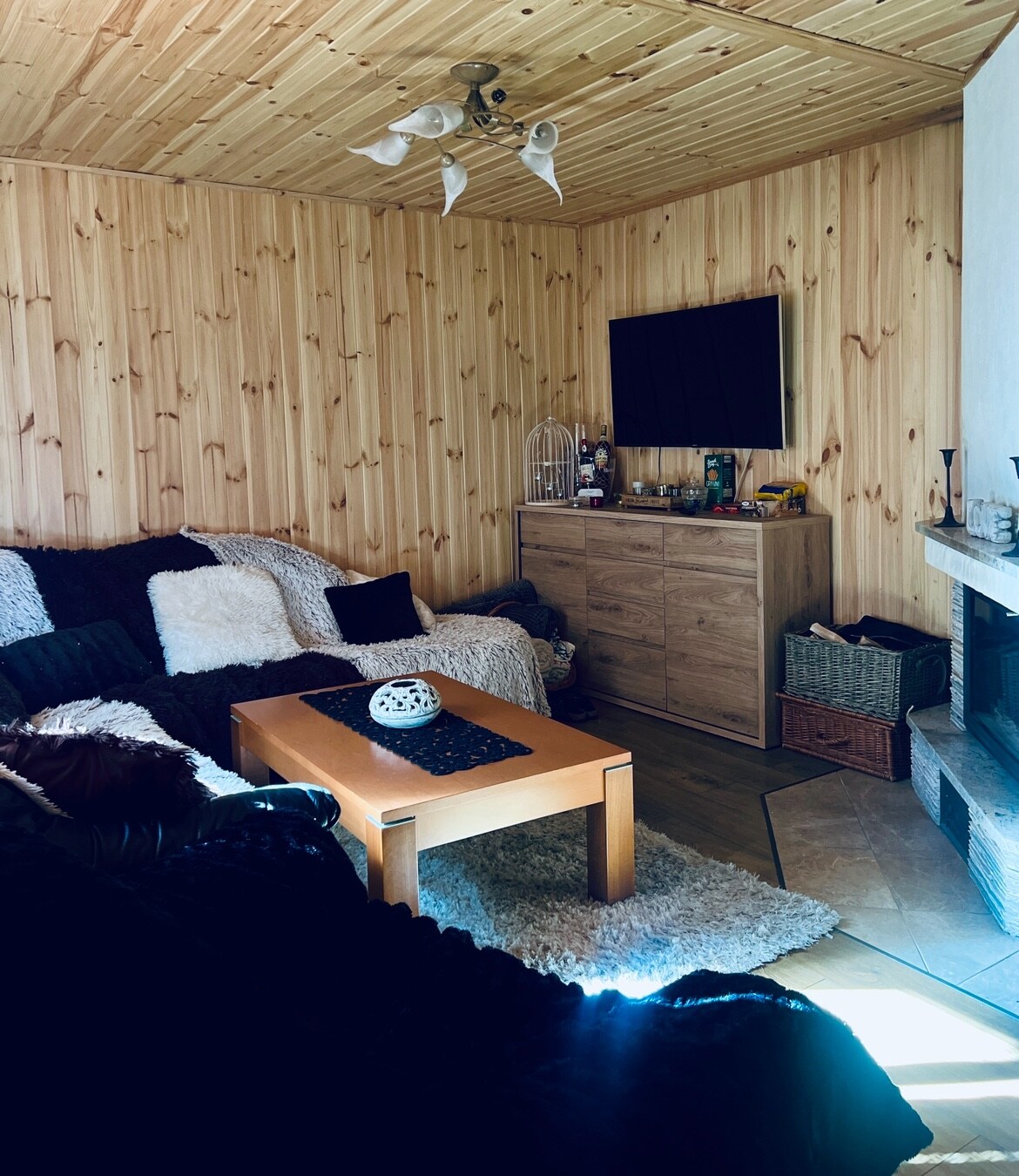 Cosy wooden house with private beach, jetty, rowing boat and fantastic view of the lake and surrounding trees. Finished to a high standard, 2 bathrooms, 4 bedrooms, living room with fireplace, fully equipped kitchen and large terrace, all designed having comfort and satisfaction of our guests in mind. On the fenced plot around the house, apart from a bonfire place with handmade benches and comfortable hammocks, you can find a lot of green space enabling all kinds of family recreation and relax.