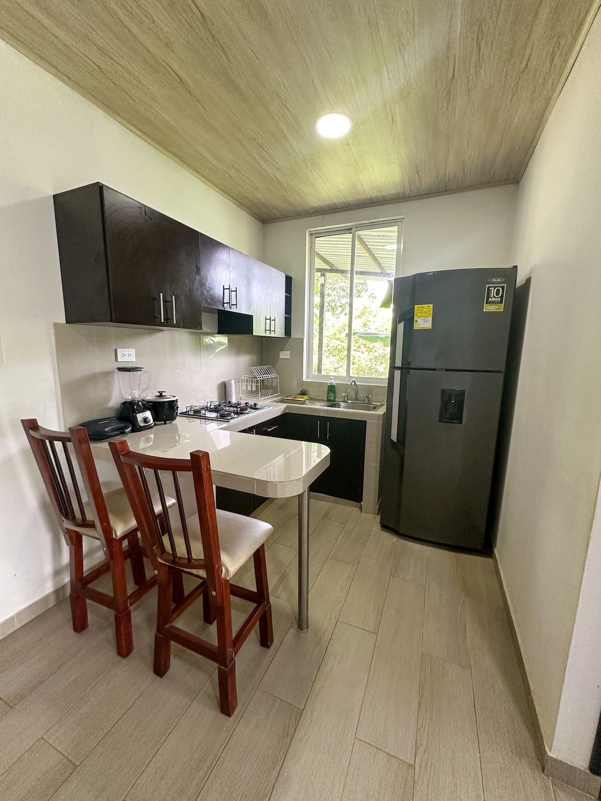 Colina Verde Ecolodge offers a unique experience in a charming cabin in the middle of the jungle. Discover the tranquility of our one-bedroom cabin, with large windows, a comfortable king-size bed, full kitchen, and outdoor dining area. Enjoy the outdoor terrace for a cup of coffee while delighting in the sounds of nature. Ready to leave your stress behind? Click "Book".