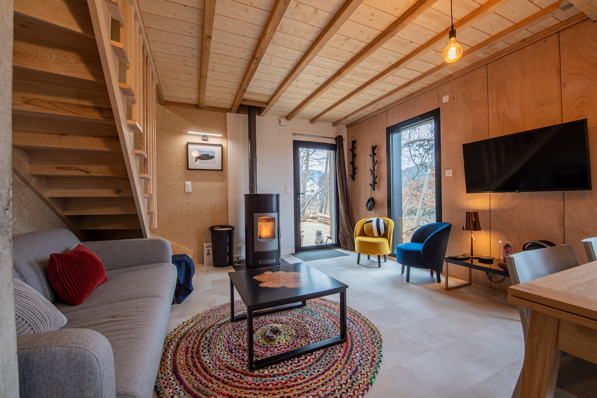 You have the Henri cottage: Located on a wooded volcanic mound, with an exceptional view of the Château de Murol, come and rest at Bois Murol. Ultra-equipped, in a designer decor and paintings by regional artists, you can relax in the sauna in the calm of the Auvergne countryside. Ideally located, you will be a 10-minute walk from the center of Murol (Restaurants, Bakery, Butcher, Pharmacy.), 10 minutes from Lake Chambon, 15 minutes from the SuperBesse slopes, and 35 minutes from Puy de Dome.