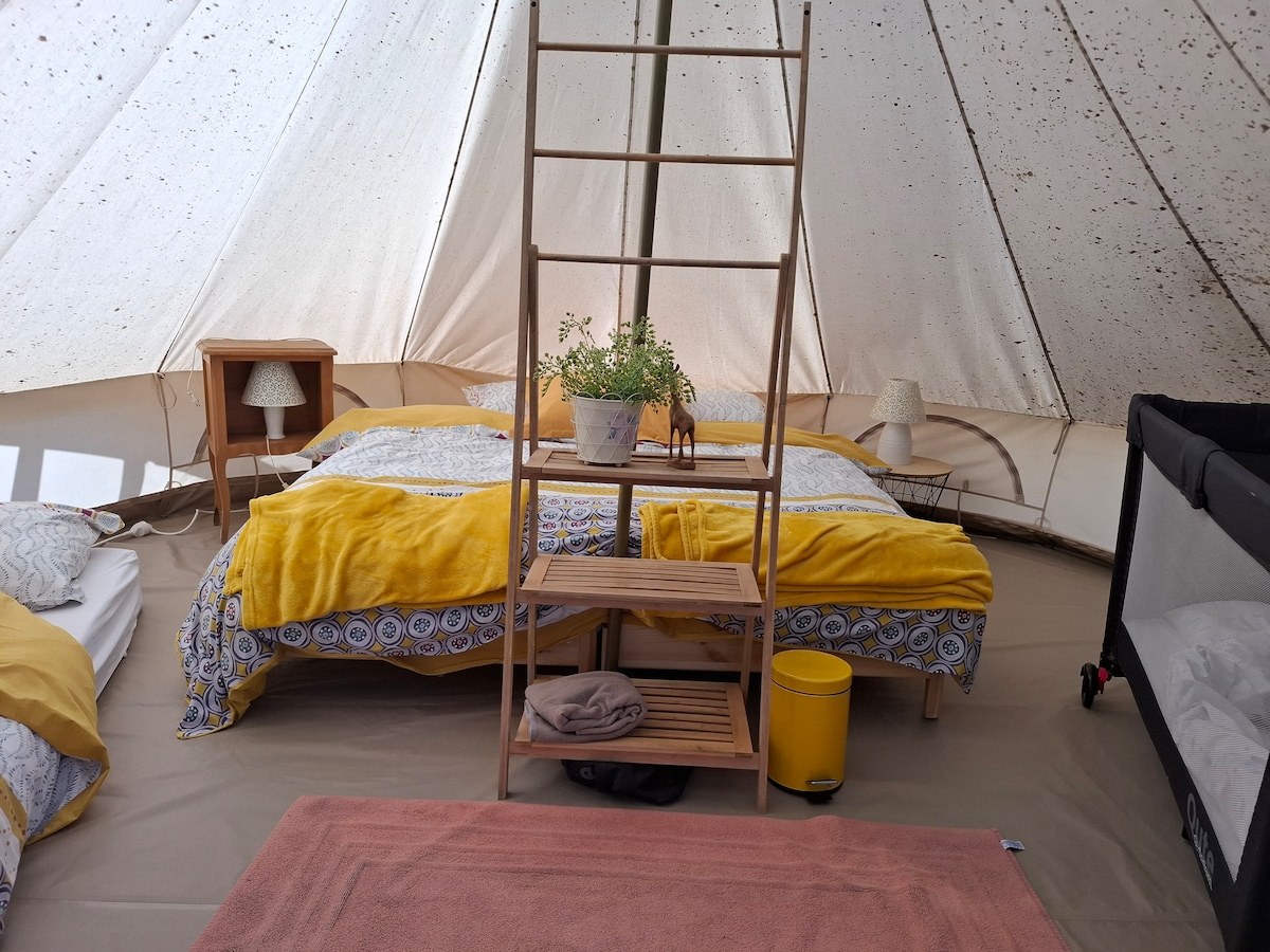 Stylish 6-metre Bell Tent (tente insolite 'tente cloche') on small, tranquil campsite Cool Under Canvas in Puy-de-Dome. King size bed and day-bed sofa (makes 2 singles). Cook on a charcoal EcoZoom stove under a cooling sail shade. Shared club room covered terrace. Shared shower/toilet/wash-up facilities. We are surrounded by verdant hills - shady summer walks from the site, great cycling country, kids' activities: Lac Fades with giant inflatables, Vulcania theme park, Parc Animalier d'Auvergne.