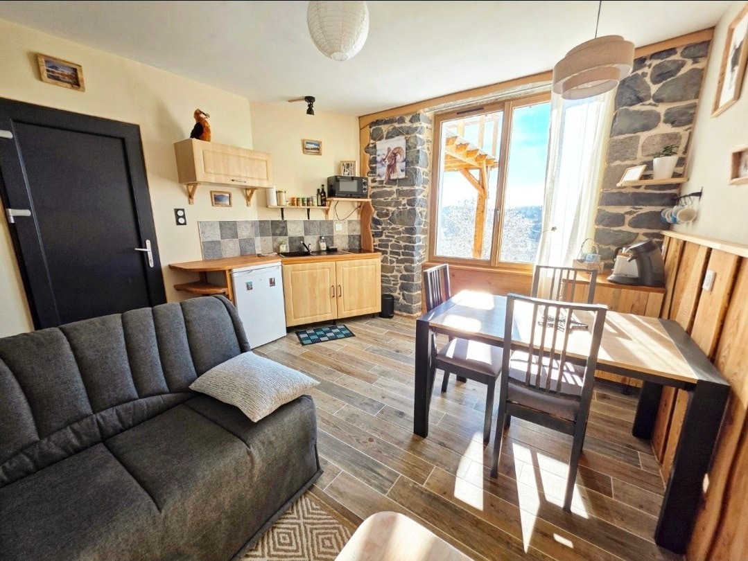 Small atypical, unique and charming cottage perched just above the city center of Mont Dore, accessible by an uphill path of about 80 m. Feeling of being immersed in nature, with a beautiful view of the Capucin Mountain… while being less than a 5-min walk to the city center, thermal baths, terraces, shops… It has an equipped kitchen open to a living area with sofa bed, a bathroom and a bedroom. Cleaning, linens and towels included.