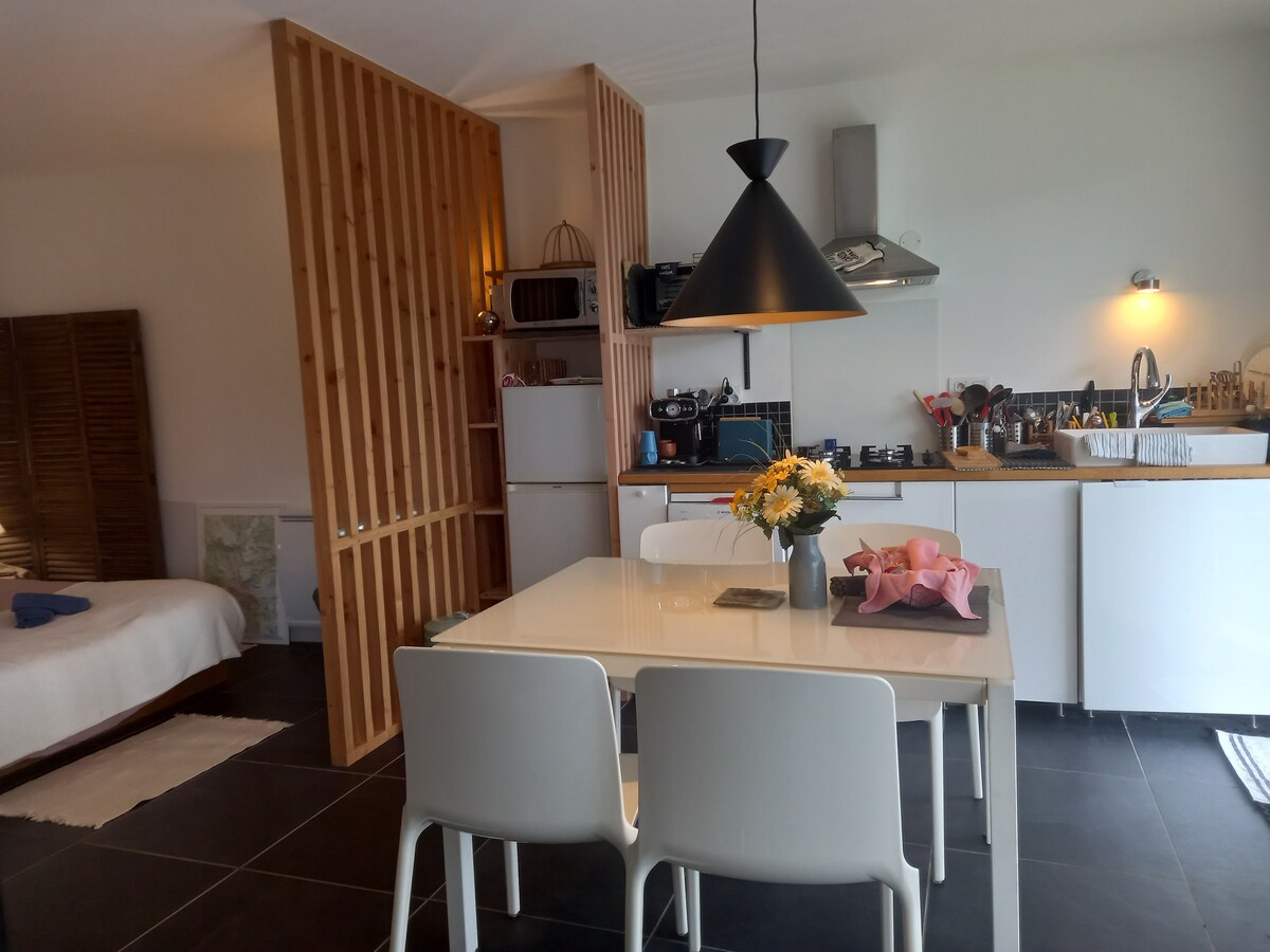 Charming Studio Spa, full kitchen, AC, giant bed