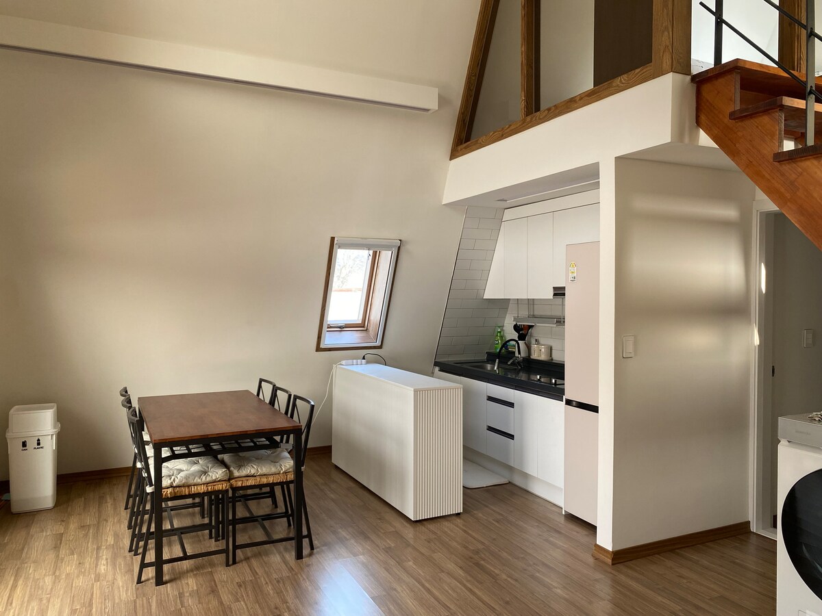 It is a cozy and emotional accommodation where you can have a barbecue at any time, regardless of the snow. _Sunday Morning House Story We are opening our family's cozy and emotional second house for rest and healing in everyday life. With a family-oriented mindset, we've decorated a space that guests can be satisfied with. You can enjoy barbecue and relaxation in a unique semo-shaped 59.9m2 private loft building and 16.4m2 independent deck. Find the emotions and relaxation that you forgot in your daily life with the healing sound of piano, steel drum, and singing bowl. I hope you have a relaxing and happy time here, like a Sunday morning. Daegwallyeong, located at an altitude of 700 meters, is a land above the clouds with blue skies and clean winds throughout the four seasons. It offers a pleasant atmosphere in summer without tropical nights, and a snowy village in winter. You can also have a warm interaction with cute animals at the nearby farms, as well as the natural environment of the 'National Forest' and the 'Anbandege' observatory, which is famous for its trekking course.