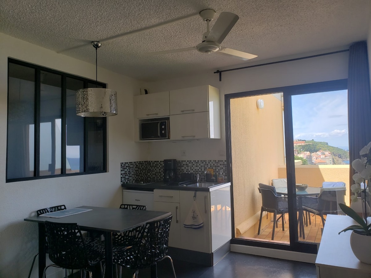 Cozy. Air-conditioned studio, residence, pool, solarium The view from the private terrace and from the solarium is quite magical (Bell Tower/Bay/Roussillon coast from Port Vendre to Leucate) The 15-minute walk that will take you from the residence to the historic center, along the seaside, is a real delight. Restaurants, shops, beaches and coves within walking distance. 2/4 couch. "Glass roof" bedroom, 140 bed + 140 sofa bed.
