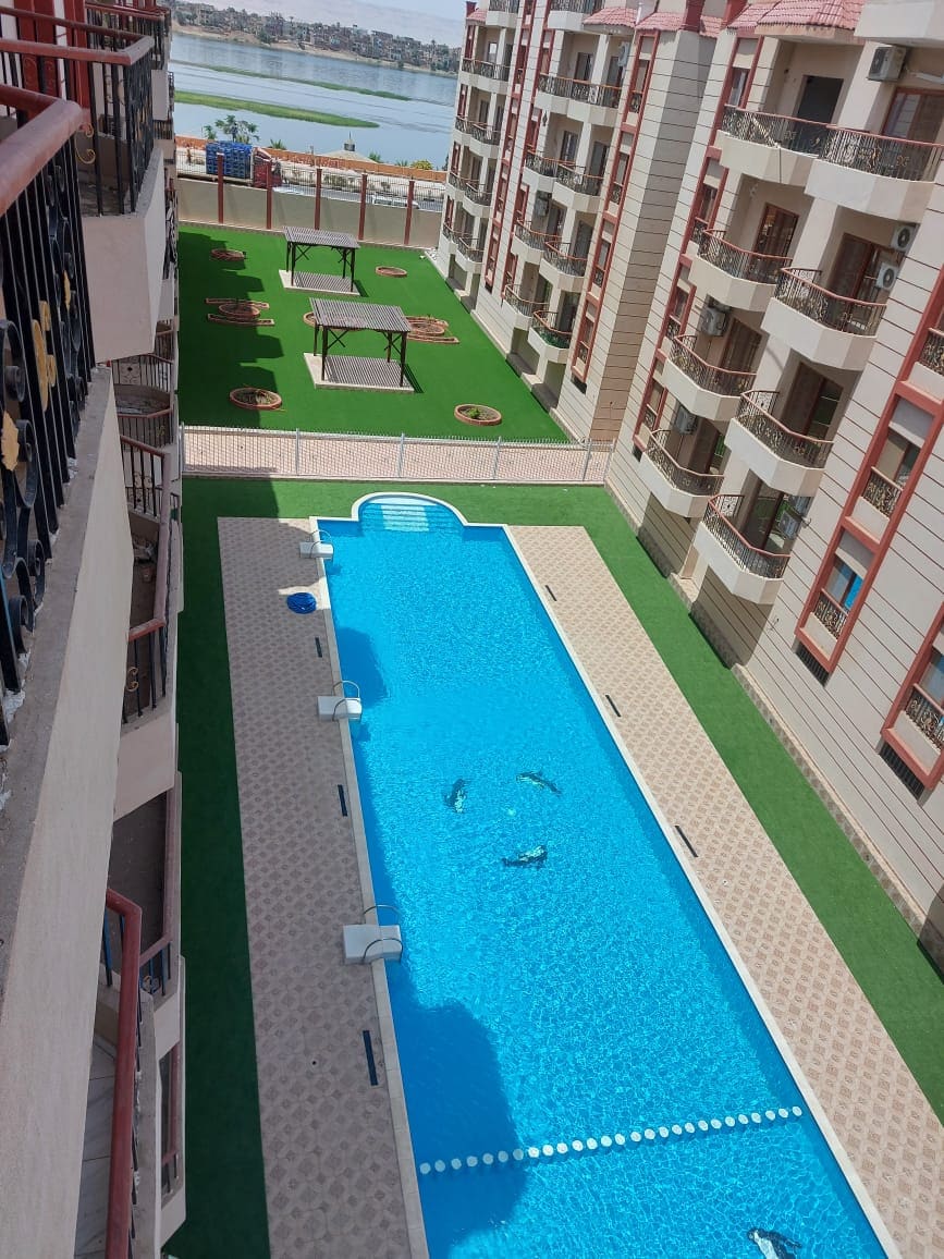 2 bedroom + living room apartment is in a newly built walled compound with a twenty four hours security located on the Nile with landscape and swimming pool . It’s five minutes away from the temple of Luxor and ten minutes away from the temple of karnak by taxi and 20 away from the valley of the kings . my appartment is overlooking the pool and the landscape and with a Nile view .It is equipped with satellite tv , refrigerator, washing machine,living room,washroom kitchen