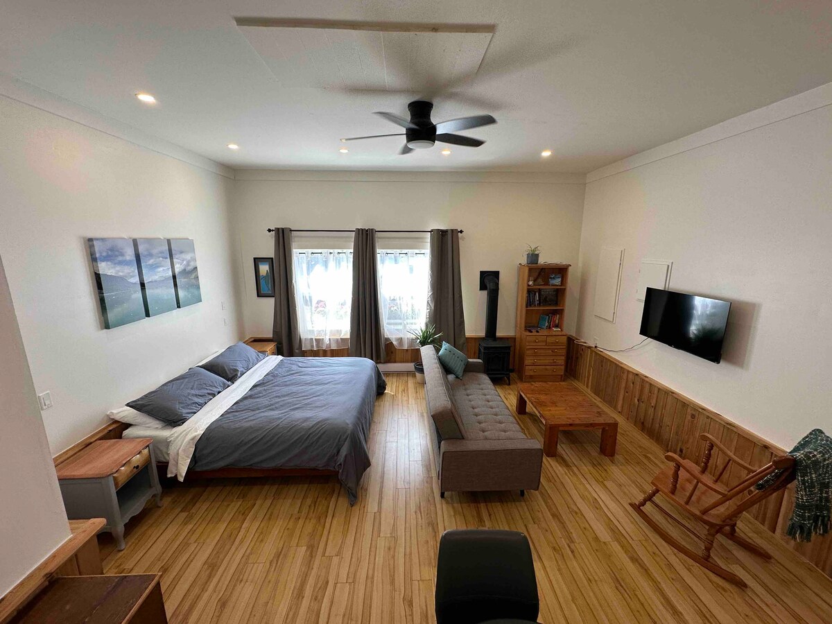 The property is surrounded with giant evergreens situated on the quaint and quiet Quinsam river. With river front access. The suite is in a separate building on the property, very private. It has funky slate floors, skylights and 12 foot ceilings. A fully loaded kitchen, which comes stocked with coffee beans, and assortment of teas. A cozy separate bedroom. There are two decks one covered, both with table and chairs and a Barbecue. We also have a PVR for recording your favorite shows.