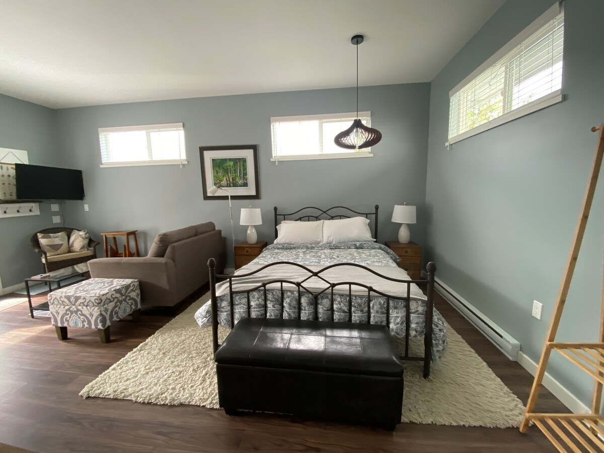 Steps to Town Center! The Hummingbird Studio in Qualicum Beach is a ground-level private studio suite ideal for people seeking a memorable getaway. Enjoy convenient access to the village. A seperate entrance through the shared backyard, a bathroom, cozy living area with a TV, guest WiFi, queen bed, sofa bed, and a well-equipped kitchenette. Keypad entry and designated parking. The studio suite is a private addition attached to our family home.