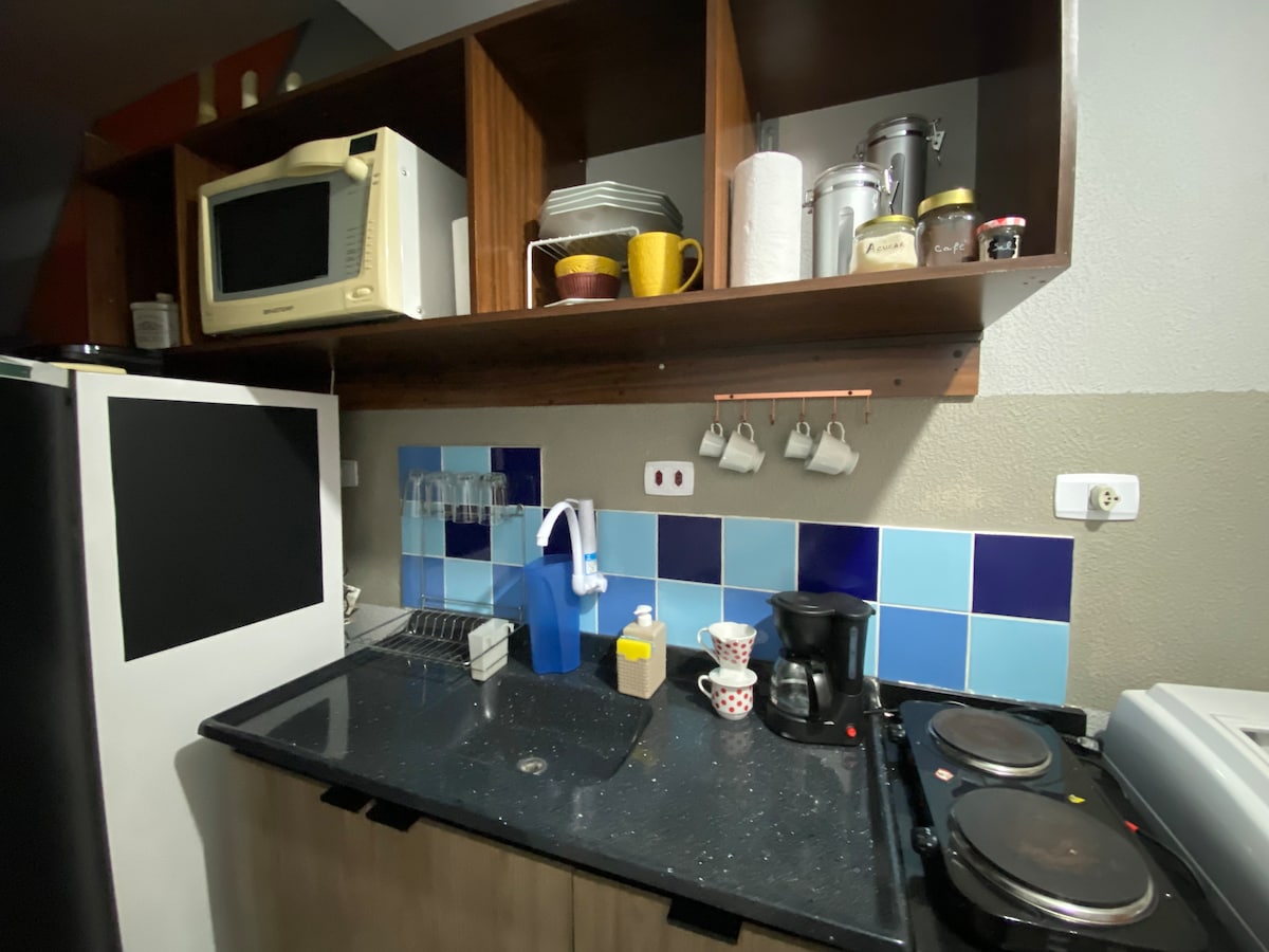 É um lugar tranquilo e bem-localizado, com padaria à 20 metros. Apartamento com 1 quarto cama queen, e sofá cama na sala. Oferecemos roupa de cama e banho. Estamos localizado à 3 quadras do centro da cidade. Estacionamento para 1 carro incluso.