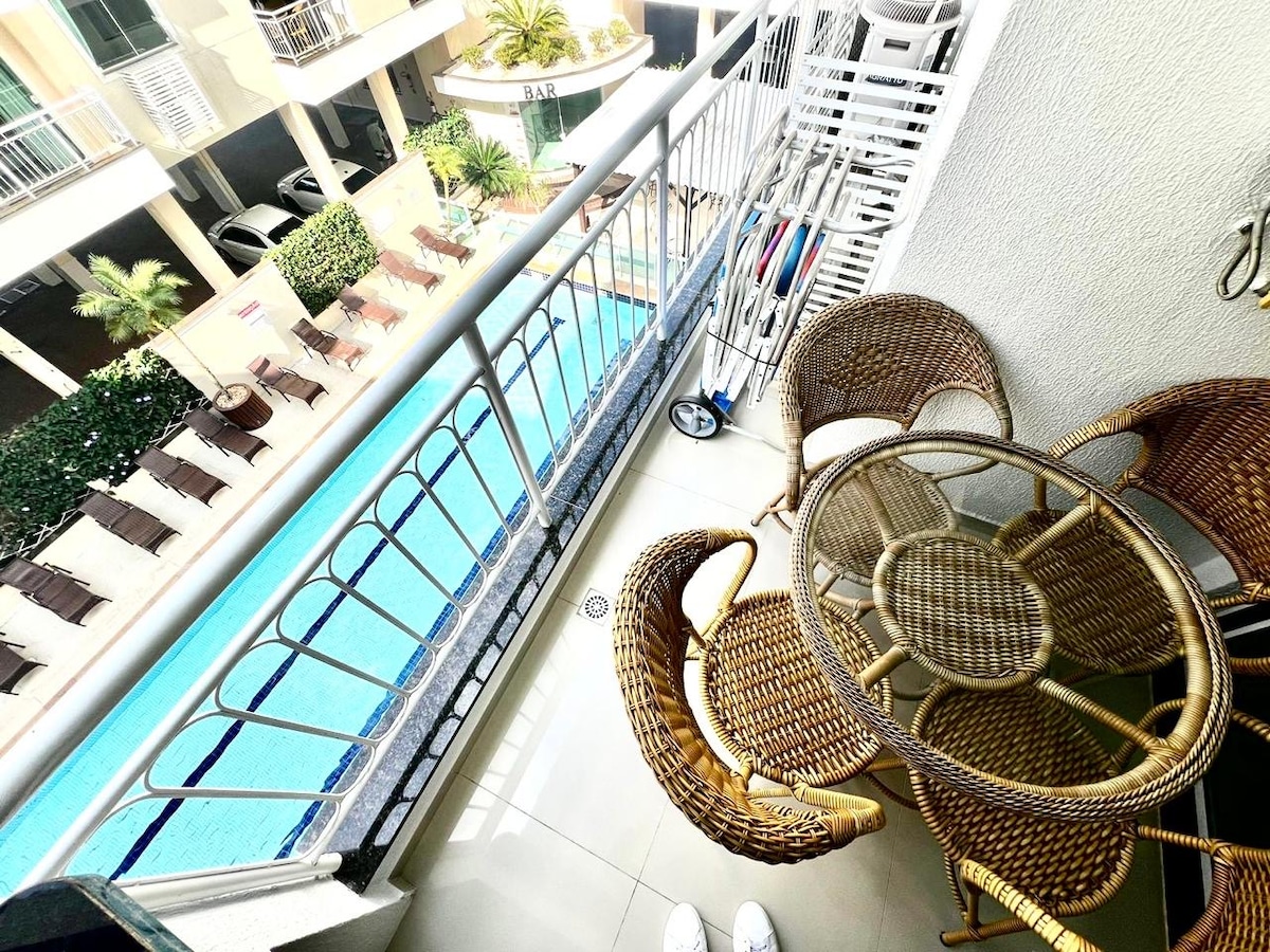 This informal apartment was designed for you to feel relaxed with those you love, whether at the barbecue on the balcony, watching the sea in the distance or the movement on the street. The integrated space of the living room, kitchen and barbecue area are an invitation for everyone to be together. The heated adult and children's pools await you! You can use the gym and the Jacuzzi. To get to the beach, just walk a block, with the cart, chairs and umbrella that are available. You'll have everything at hand and you won't even need to use the car.