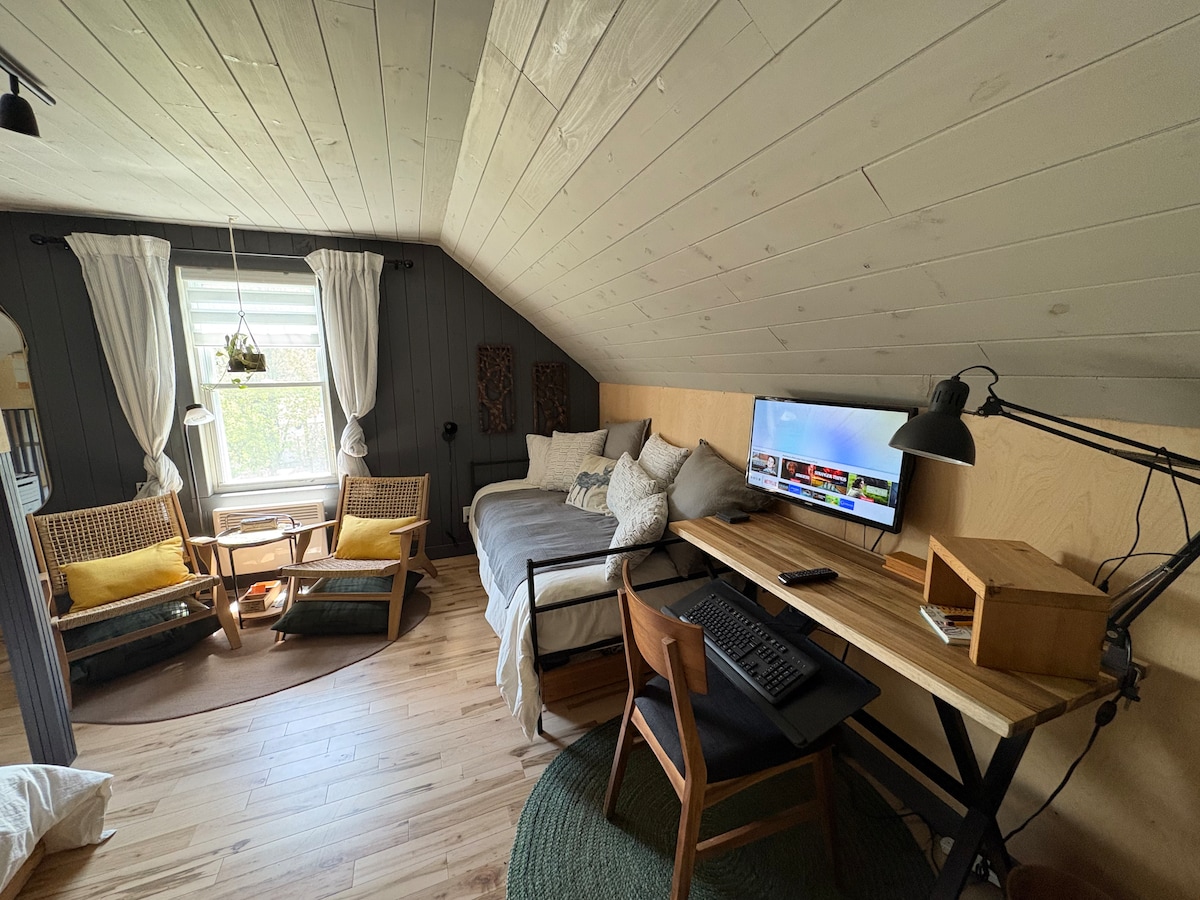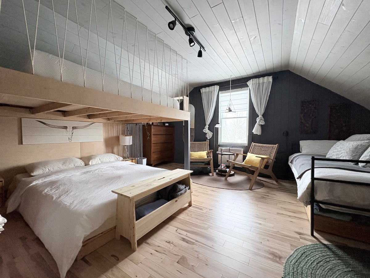 New in 2026: no pets. LIVE MUSIC on Tuesday, Friday, and Saturday nights! This is a private room above our licensed bar, Bongopix Tavern. We serve food, alcohol, and espresso coffee 3 nights a week (Tues/Fri/Sat). Enjoy Algonquin Park during the day. Party at the Tavern at night! All guests must be age 19+
