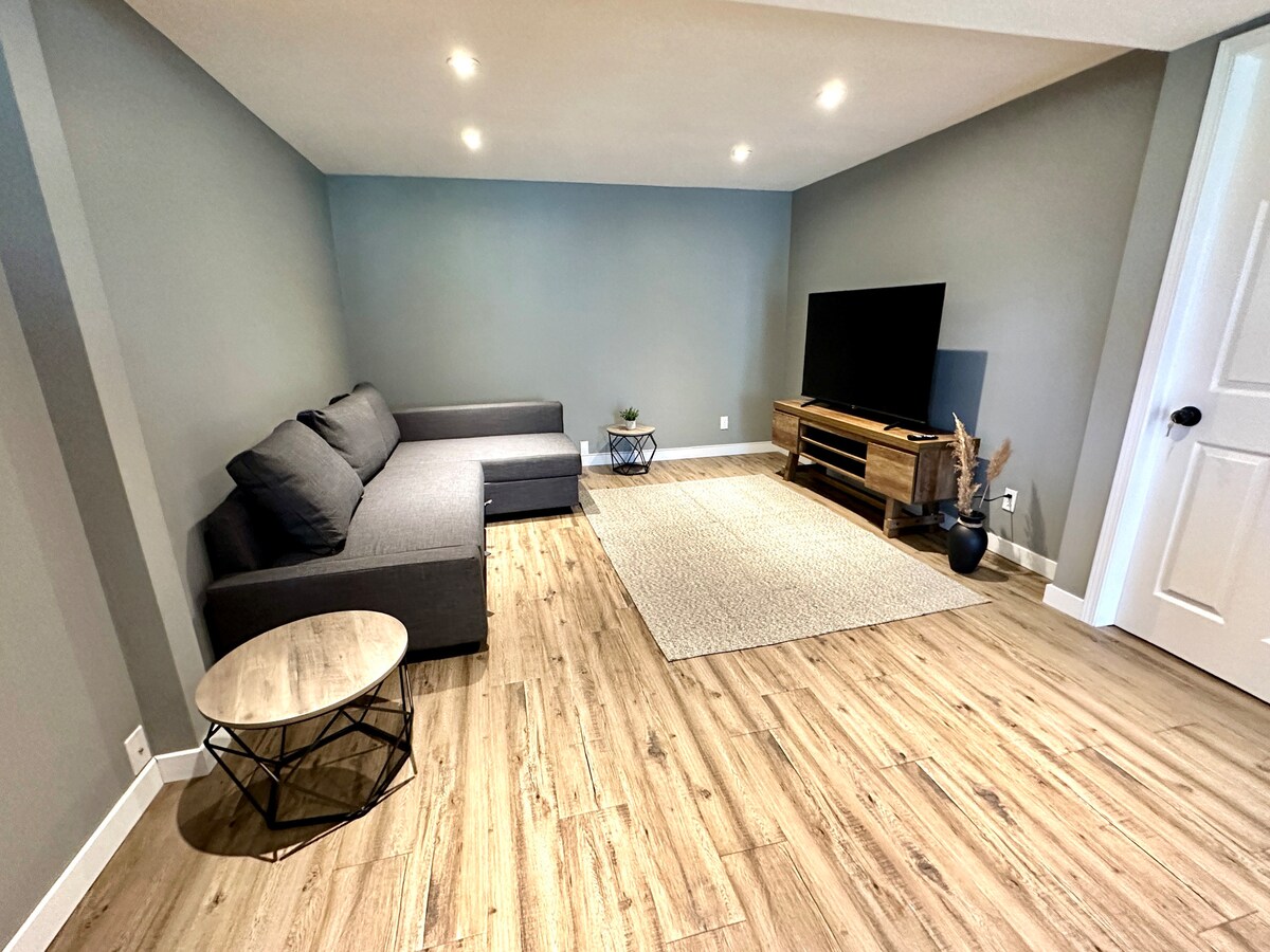 An exotic separate entrance basement suite located in the beautiful community of Belmont SW. This new property is equipped with 80” smart TV, high end recliner sofas, a queen bed that contains super comfy memory foam gel mattress, a tea station, and an entertainment corner. This entire unit is designed to make your stay relaxing, fun filled and memorable. It is pet free, smoke free, family friendly beautifully decorated home.