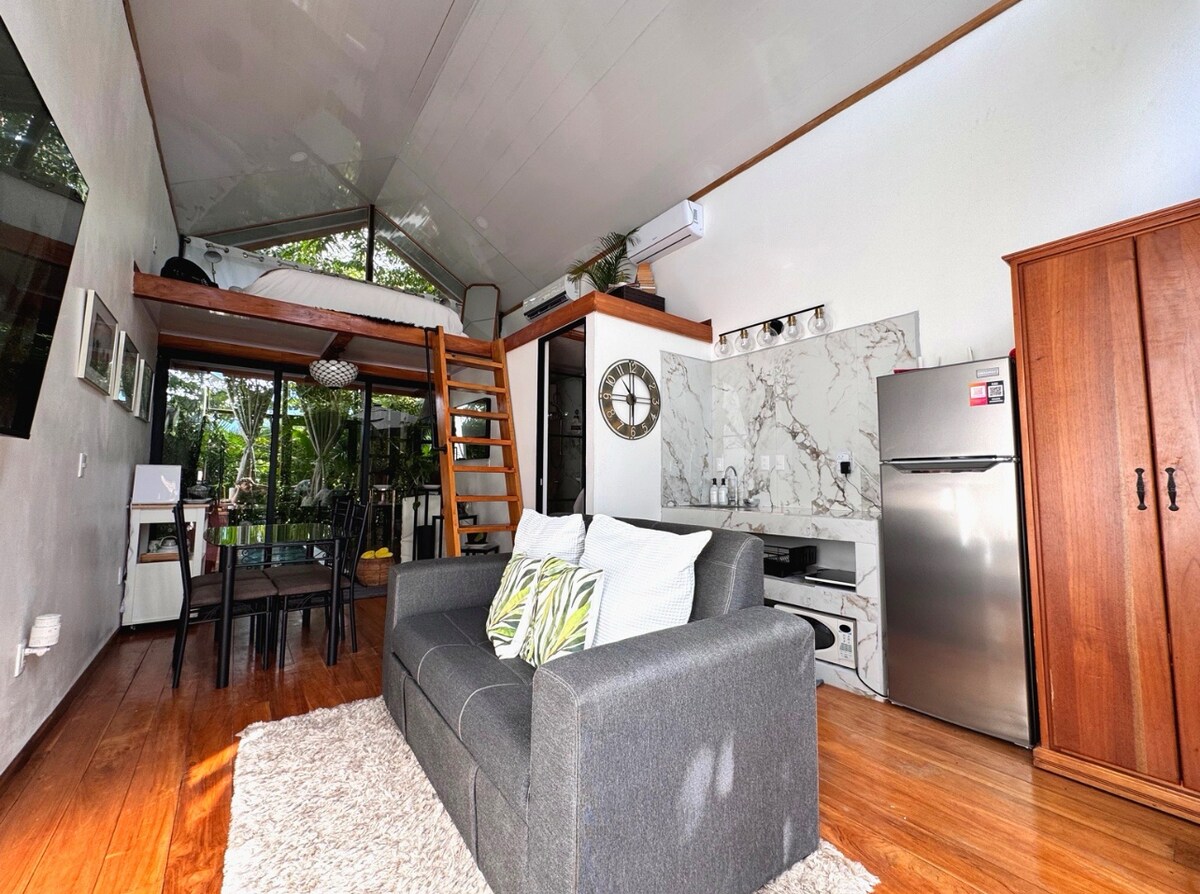 Casa Tucan is a stunning, modern, and cozy loft located in the heart of Manuel Antonio, less than 10 minutes away from the National Park. This air-conditioned loft features a queen bed and a sofa bed, comfortably accommodating up to 4 guests. The kitchenette have all the essentials to prepare your meals. From the balcony, you can enjoy sightings of toucans, monkeys, macaws, and a variety of other local wildlife. Nearby you can find numerous other attractions to enhance your stay.