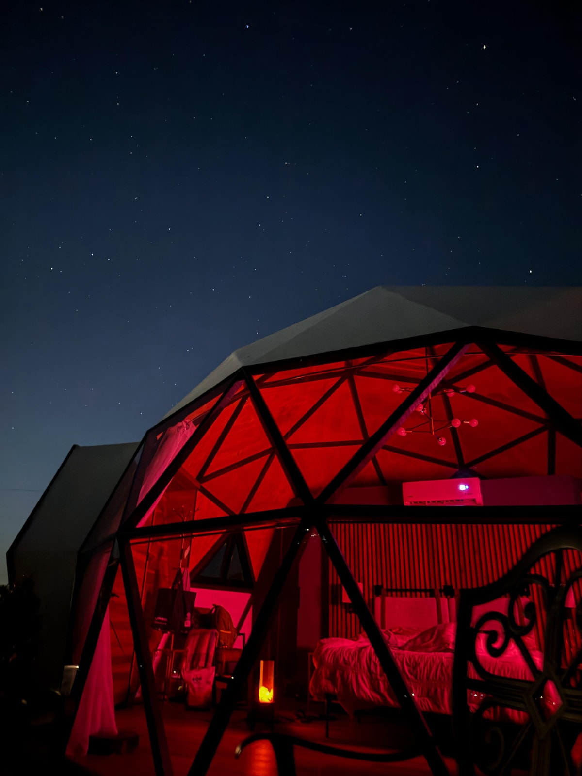 **Bienvenidos a nuestro Domo Individual** Ubicado en lo alto de una pintoresca montaña, dentro del viñedo de Puerta del Lobo, te damos la bienvenida a nuestro Domo individual, ideal para parejas en busca de una experiencia única y lujosa. Te ofrecemos un diseño elegante y moderno, con una cúpula transparente que te permite contemplar las estrellas desde la comodidad de tu cama tamaño king. La decoración está cuidadosamente seleccionada para crear un ambiente romántico y acogedor.