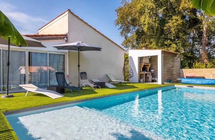 Relax in this comfortable and elegant 100 m2 villa - Rated 4 stars "Étoiles de France". In the heart of the vineyards and the greatest wines in the world. The ocean is 15 minutes away on more than 30 km of beach. Completely renovated, warm, bright; this charming villa offers a beautiful living space of 45 m2, fireplace with insert, kitchen, 2 beautiful bedrooms with queen size beds, 1 bedroom with bunk beds, 1 bathroom, walk-in shower, 1 veranda, 1 barbecue, 1 large garden.