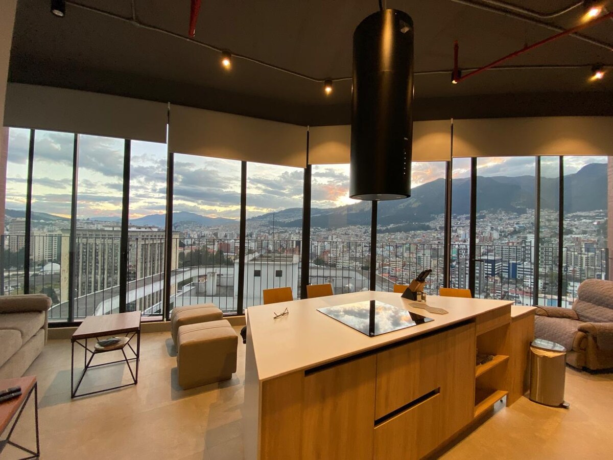 Comfortable, safe, modern, no noise. Panoramic view of the Pichincha volcano, large window, balcony. Ideal for enjoying Modern and Historic Quito, 15 minutes by car. Fibre optic WiFi, up to 550 Mbps Fully equipped. Hot water 24/7 Free parking and gym inside the building. Modern and safe building, 24/7 security Ground Floor Cafe. Residential/executive/banking area Restaurants, Supermarket, Pharmacies, etc. Public transportation at the foot of the building.