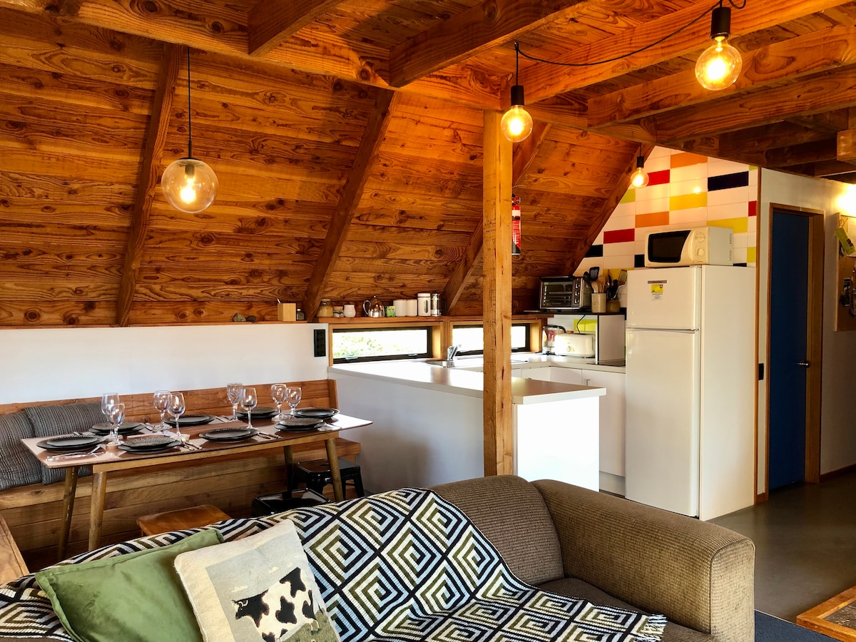 This container home is set in a private spot surrounded by native bush with a view of the mountain through the trees. The interior of the cabin consists of a separate bedroom with a queen size bed, a fully equipped kitchen, lounge and wood burner. The container has a cosy ambience with lots of light on a sunlit day. Large ranchsliders connect you to the natural world outside for hiking, kayaking, canoeing, skiing or mountain exploring. Walk across the road to dine or relax and cook at home.