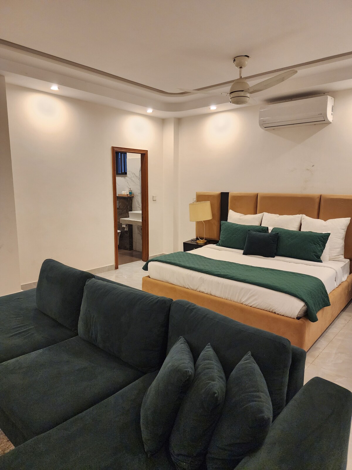 Our 1 BHK Orbit Penthouse in DHA Phase 5 is where urban chic meets celestial cool. Think: a glowing moon wall for those late-night selfies and a bold dollar-stacked art piece that screams "main character energy" Wake up to park views from your private balcony swing, binge your faves on the 50" 4K Smart TV, or cook up something aesthetic in the fully loaded designer kitchen. The interiors? Abstract, stylish, and made for the feed. Plus, you're right next to Lahore's hottest dining spots.