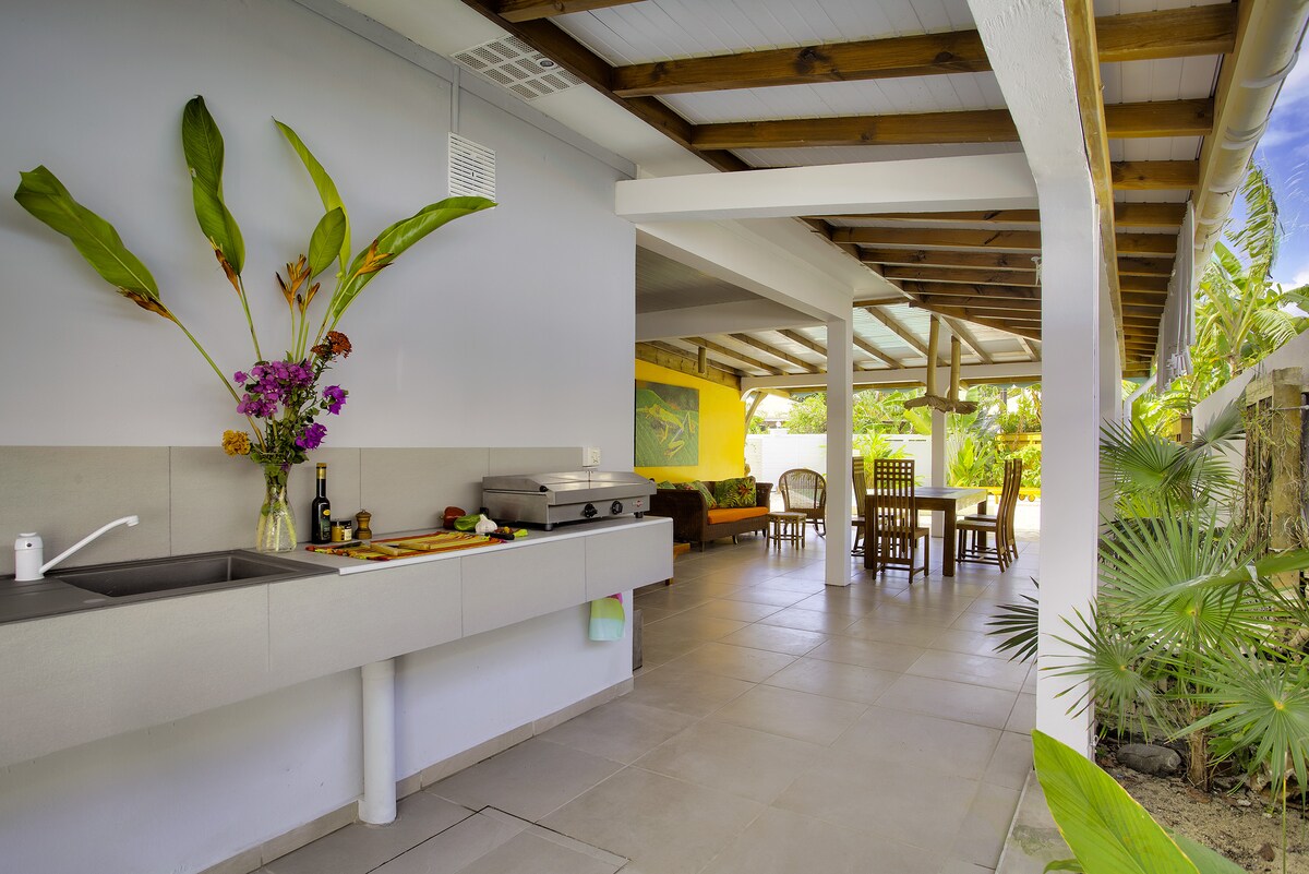 Beautiful individual villa open to the outside, equipped for 8 people in a closed tropical garden with large saltwater pool. House with cozy and tropical decor where everyone will find their place in complete privacy. Enjoy its 4 air-conditioned bedrooms overlooking the outdoors, 4 bathrooms, open kitchen and outdoor plancha/bar area. Quiet area 5 minutes' drive to St François and its beaches, golf, airfield, kitesurfing, diving club.