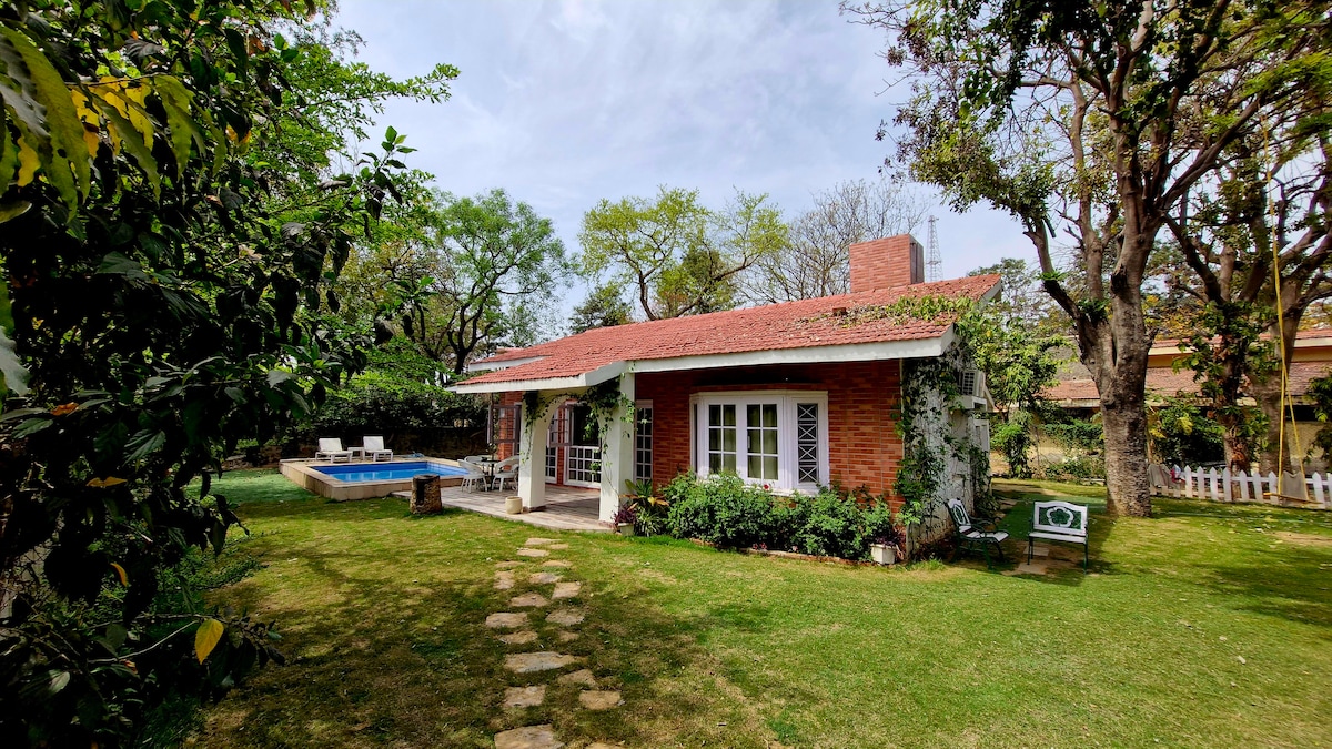 A British-style cottage in the country with beautiful roses, lush lawn, a romantic pool for a happy getaway from the city. An hour's drive from Gurgaon, the cottage is set in a lovely row of farm houses, close to mustard fields and a cricket ground. Very close to Heritage Transport Museum (5.3 kms) and NeverEnuf Rail Garden (3 kms). Perfect setting for a weekend away.