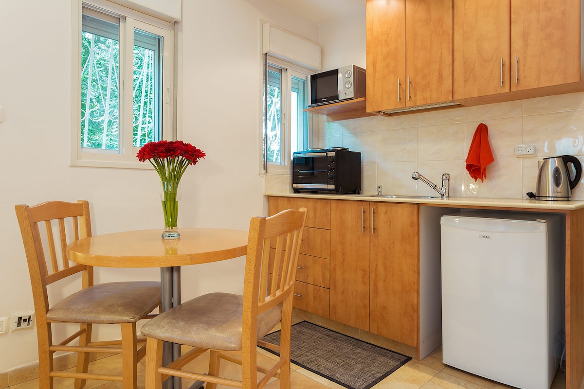 Charming garden apartment. Two private ensuite rooms, each with its own entrance, kitchenette, and bathroom, connected by a lockable internal door. One room has a double/twin bed; the other a comfortable sofabed (not splittable), with option to add a roll-away or crib. Includes dishwasher, washer, dryer, iron, and fresh linens, plus a garden with outdoor dining. Direct access to a secure indoor shared safe room (mamad) next to the apartment, shared with the homeowners. A very cozy apartment.