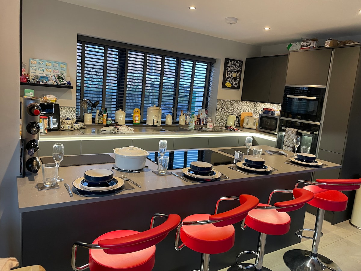 Modern, newly decorated basement flat with smart home technology for zoned lighting control. Features two bedrooms, open-plan lounge with corner sofa, and flat-screen TVs with Netflix. Kitchen includes modern appliances: filter tap, American-style fridge/freezer, dishwasher, microwave, and pod coffee machine. Bathroom with bath and shower. Utility room and dedicated work area. Free on road parking and WiFi via QR code. Self check-in. Family friendly. Contractor friendly.