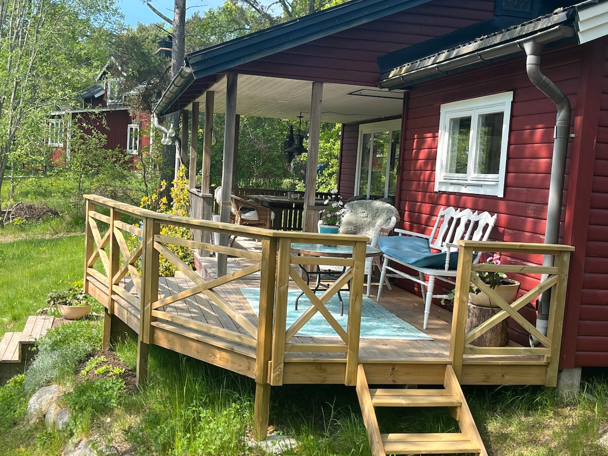 Newly-built cottage of 30 sqm. 5 minutes' walk from the harbor. - Open-plan with kitchen and living room in one. - Sleeping loft with 2 single beds. - The living room has a sofa bed. - The kitchen has an induction stove and oven. - Fully tiled bathroom with toilet, shower and washing machine. - Large terrace around the house with dining area. - The view consists of pine and blueberry forest - Cleaning is not included. - Pets are not allowed - Guests bring their own bed linens and towels (can be rented for SEK 150 per person)