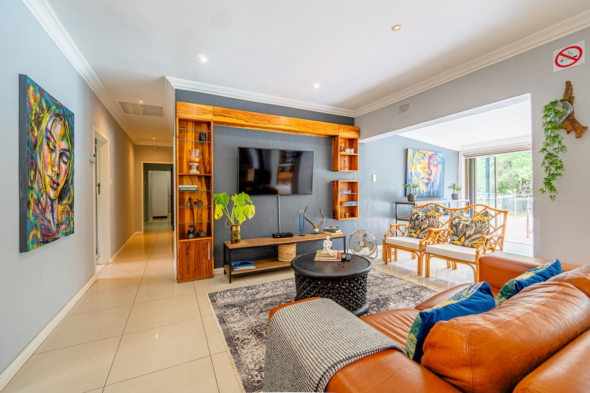 Beautiful boutique self-catering house, ideal for a group of friends or family Within 5 5-minute drive of Fourways and Monte Casino. Expansive garden Large boma with braai facility Beautiful seasonal swimming pool Built-in bar and lots of space to move freely and enjoy Daily cleaning service on request Fully Secure Enclosed secure parking FREE WIFI throughout the whole house!