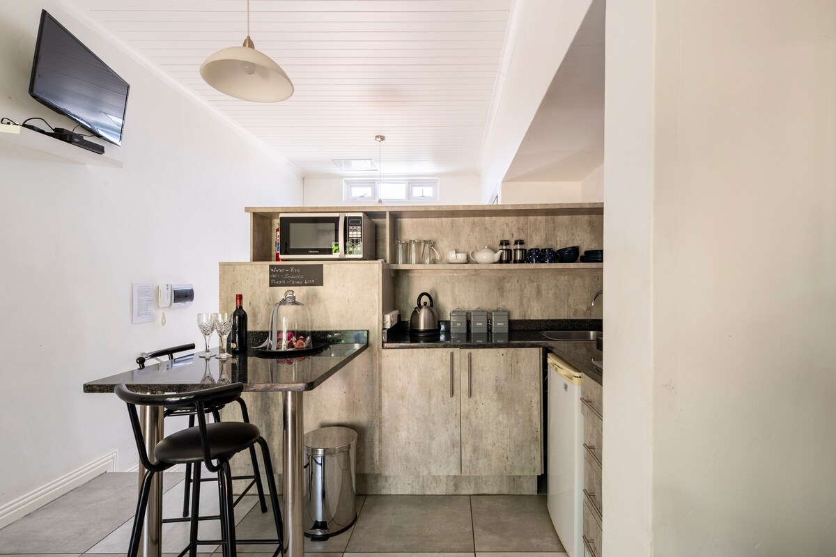 The apartment is stylish and smart. Fully furnished, with full DSTv/Netflix/etc and 100 Mbps internet. This beautiful cottage can accommodate 2 guests and comprises a separate bedroom, furnished with a queen-size bed. A separate shower, a toilet, and a washbasin are available in the en-suite bathroom. Linen is provided. This cottage features a living area with a kitchen equipped with all the modern appliances. Braai/barbeque facilities with outdoor furniture are on the patio.