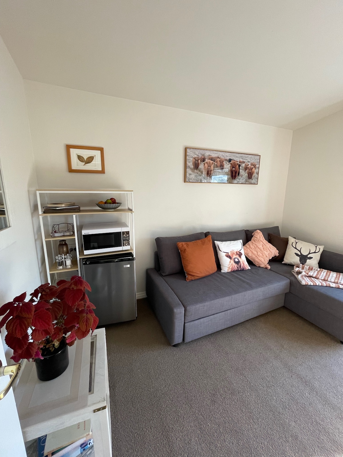 This modern ground level, cosy & quiet apartment opens to a north facing Zen Garden soon to be completed by a local landscaper. The queen bed is noted as extremely comfortable with luxury cotton, wool & down linen with an electric blanket in winter. The sofa bed in the living space is available at an extra charge of $20 p.n. for linen for a second or third person. An additional fold up bed also available for $20 p.n.
