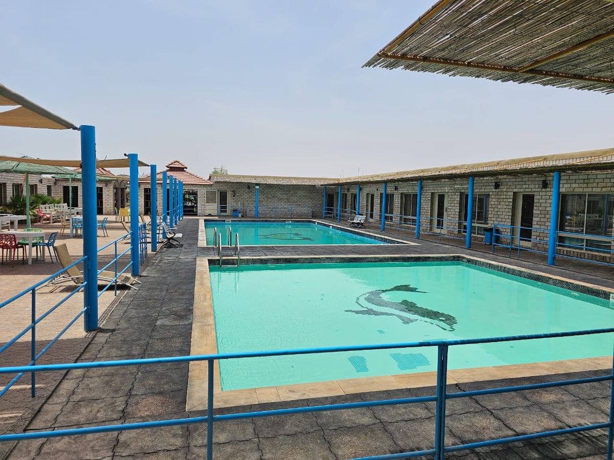 Enjoy peace and relaxation with your family in this quiet home, which has some pets such as birds, ostriches, peacocks, and various outdoor seating, and there is an outdoor heritage-style sitting area. We advise dear guests to bring the drinking water and food they need with them, as they can cook in the outdoor kitchen where all cooking equipment is available. Note: There is no supermarket near the rest area