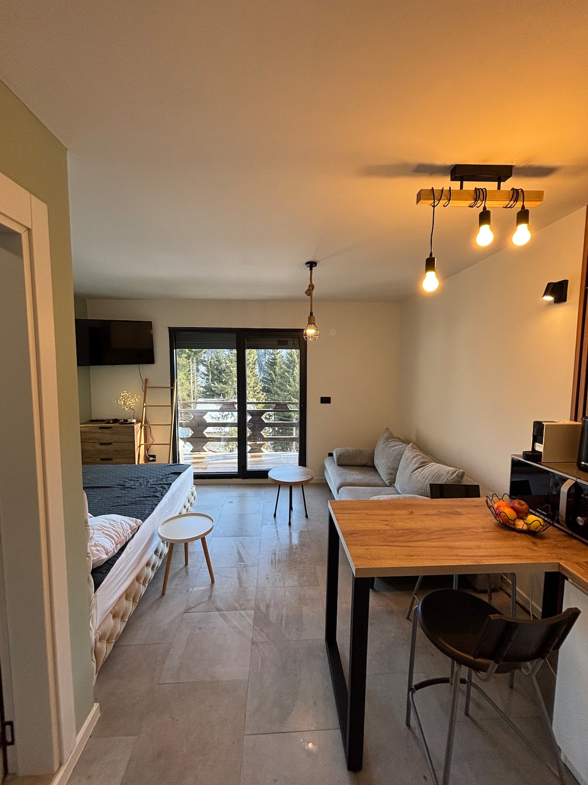 Experience peace and comfort in this stylish 1-bedroom apartment, nestled in the heart of Kopaonik. Perfect for couples, small families, or remote workers, this home blends modern design with the serenity of mountain living. Enjoy breathtaking views, fresh alpine air, and easy access to restaurants, wellness & spa, and outdoor adventures just steps away.